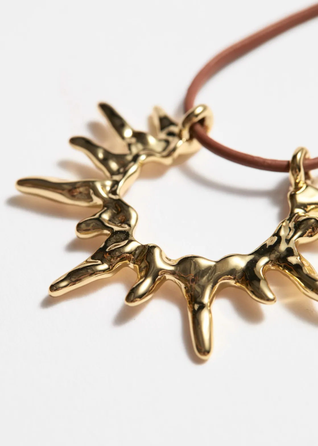 This necklace is suspended from a slender leather strap, the striking pendant is crafted from plated brass and has a molded, hammared silhouette.