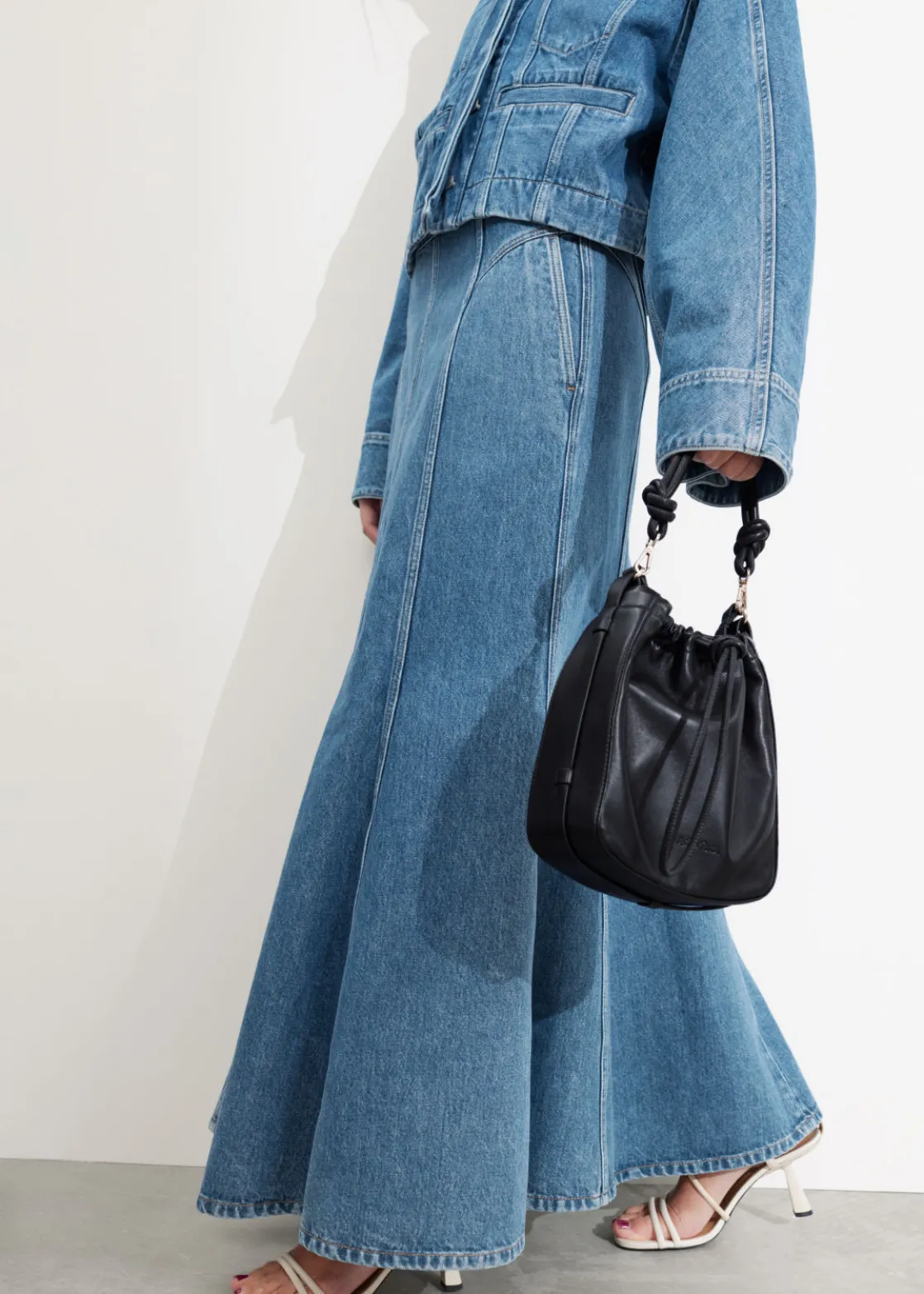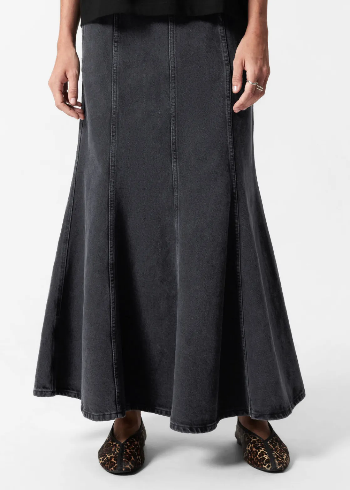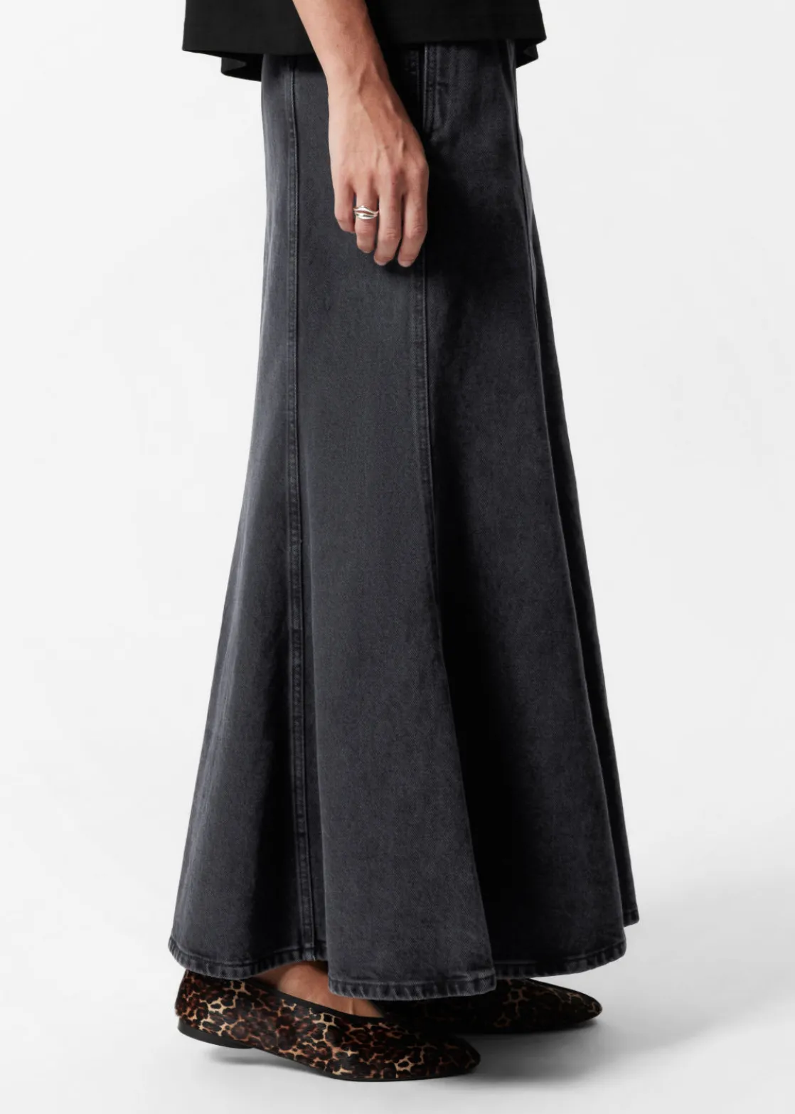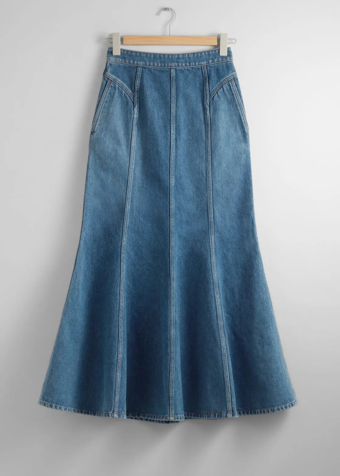 Denim maxi skirt featuring topstitched panels that fall to a flared, gently pleated hemline.