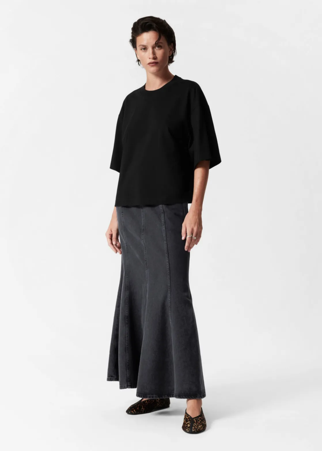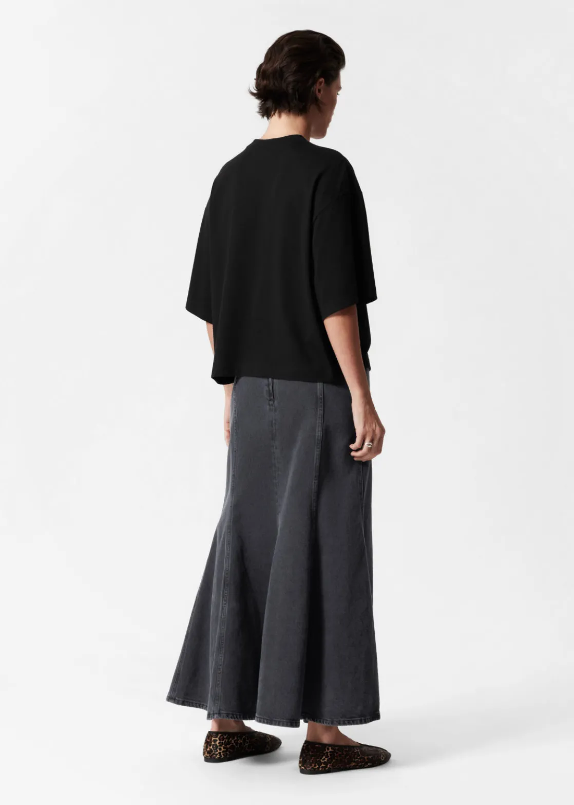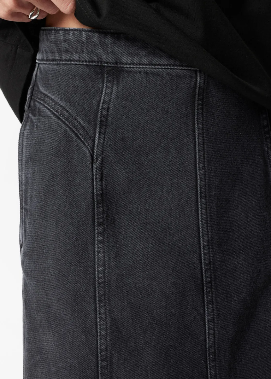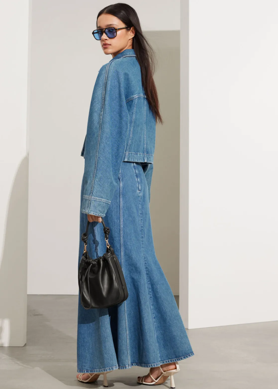 Denim maxi skirt featuring topstitched panels that fall to a flared, gently pleated hemline.