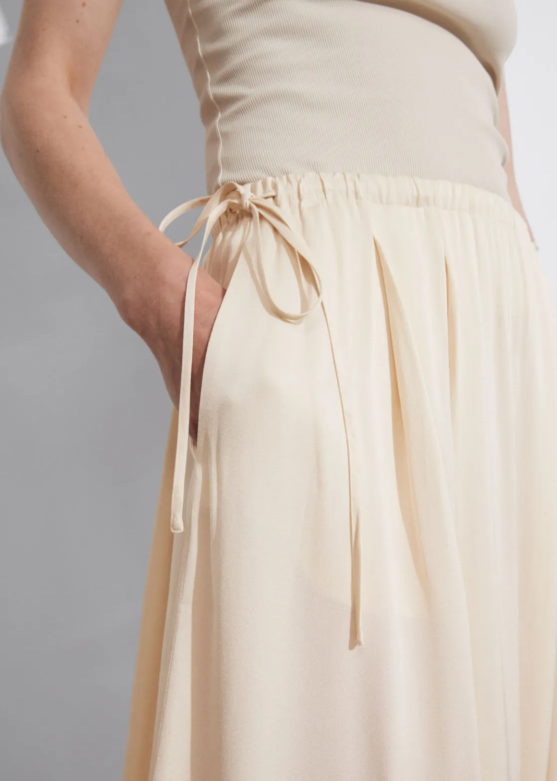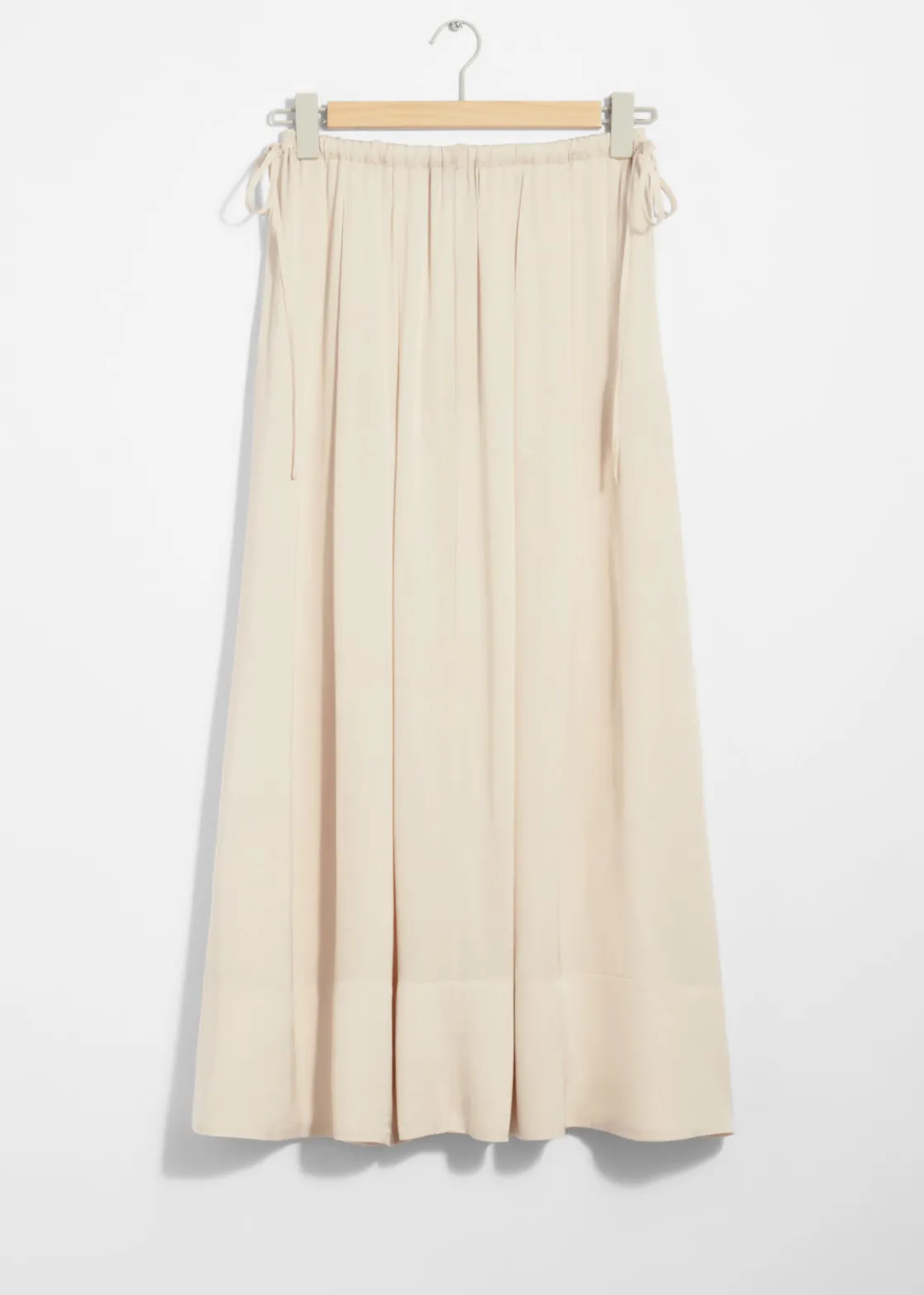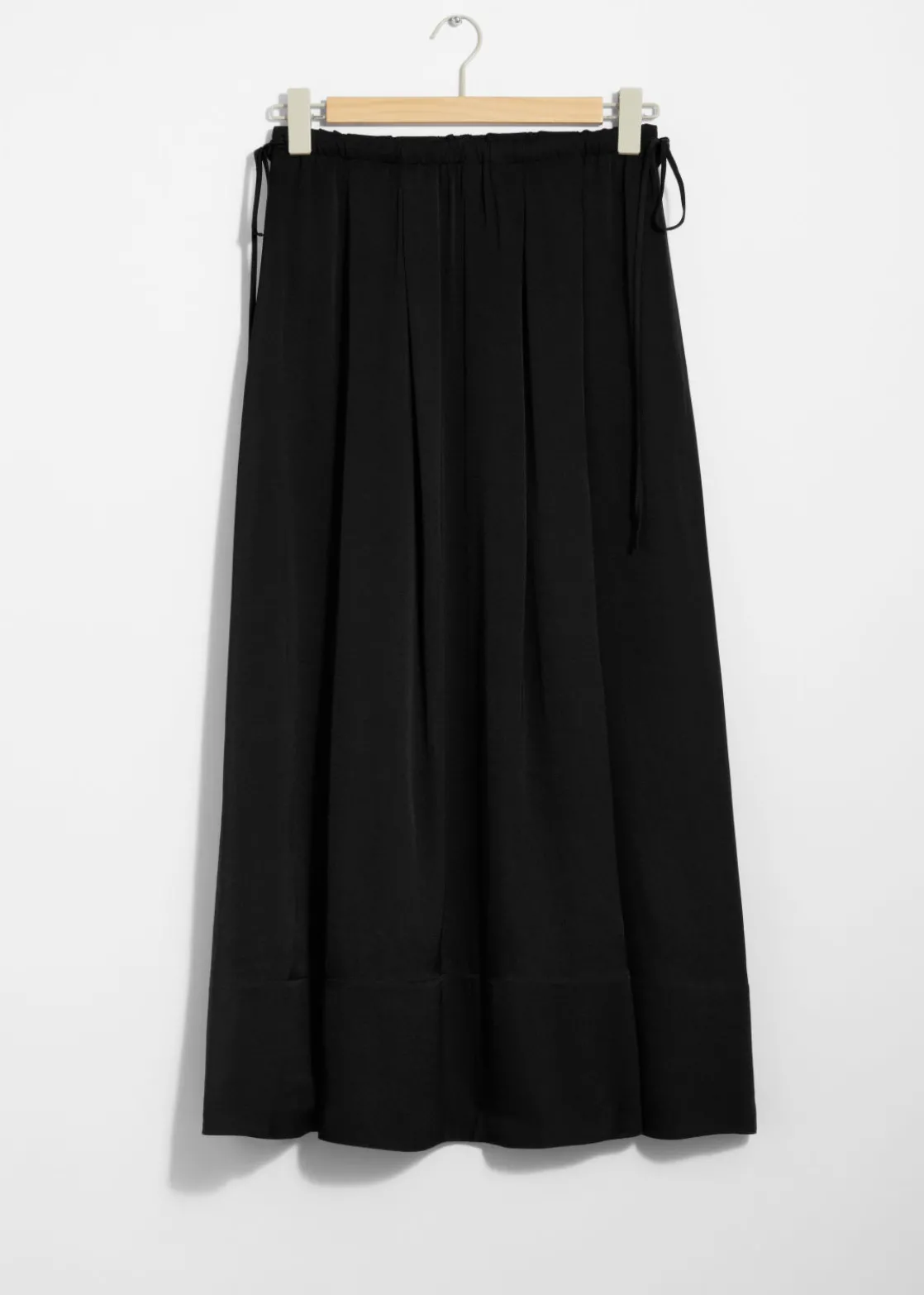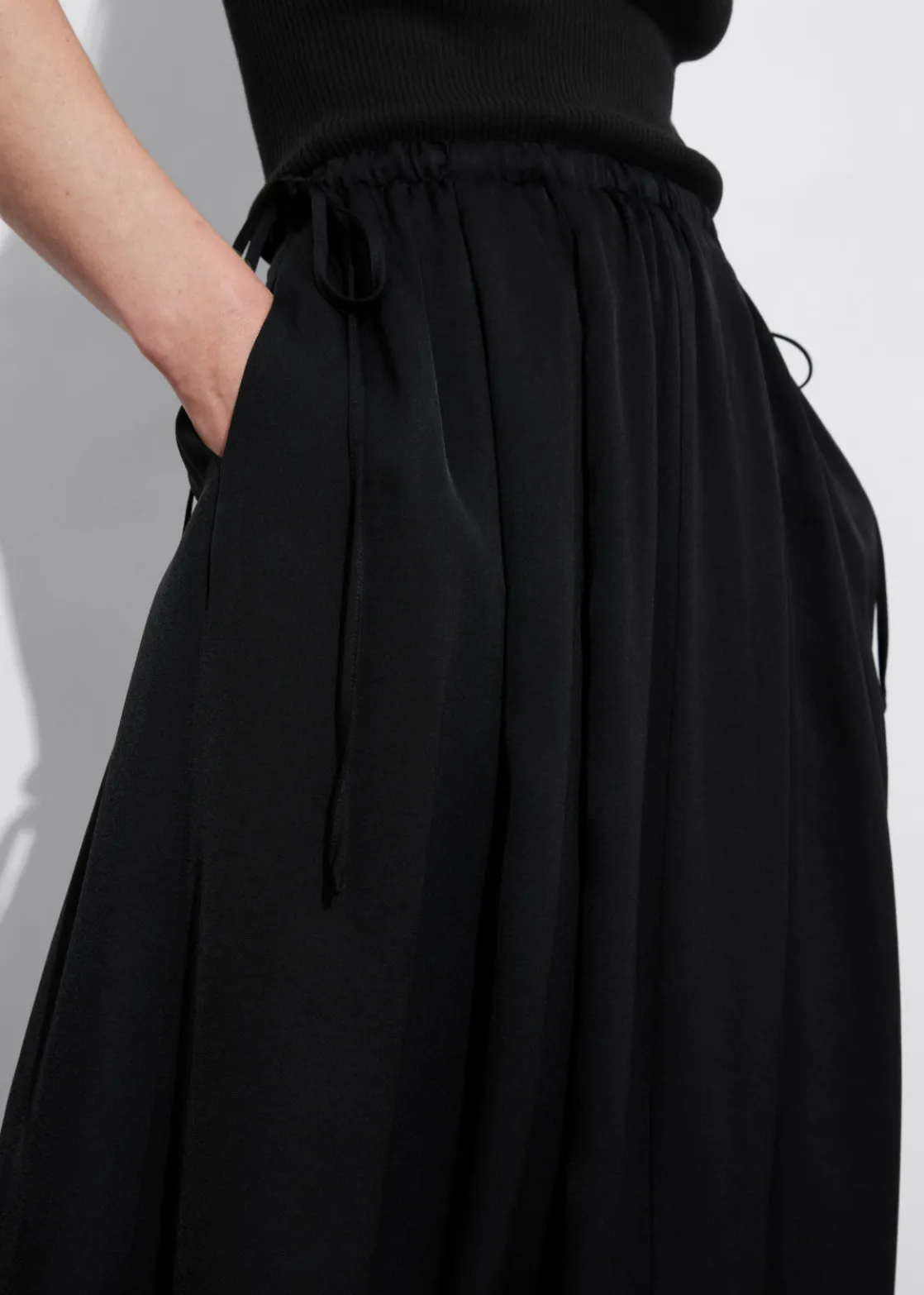 A-line midi skirt featuring a pleated finish and a drawstring waistline.