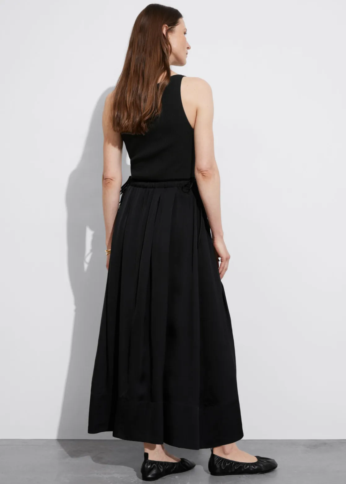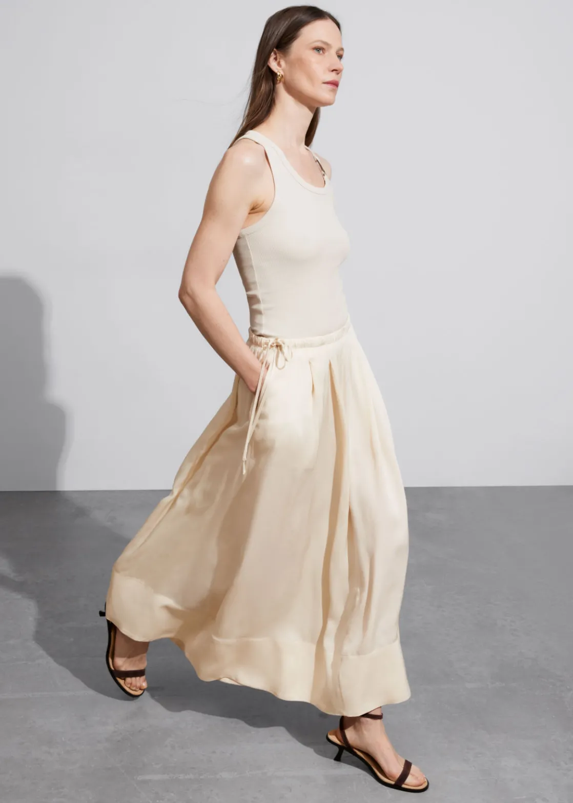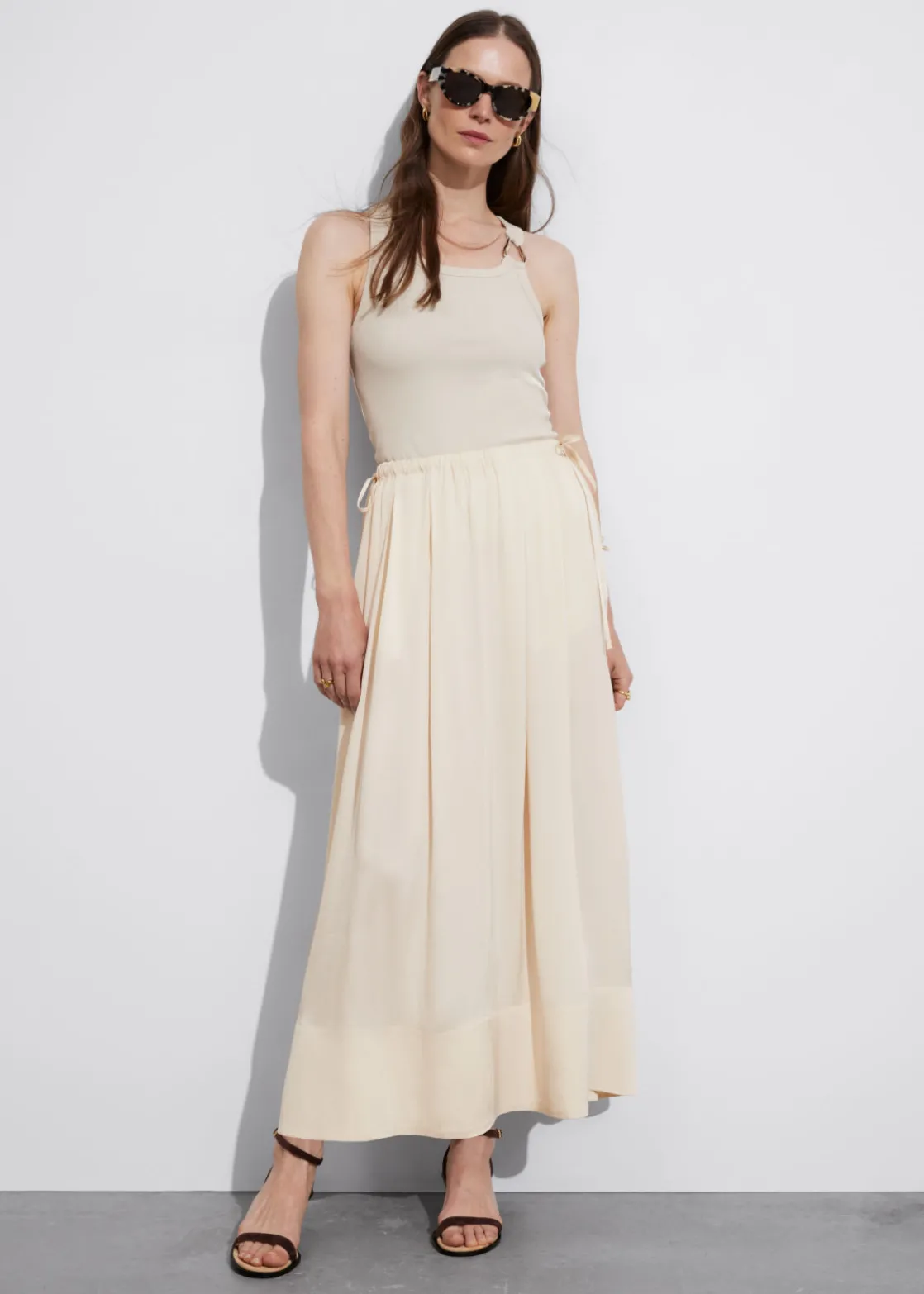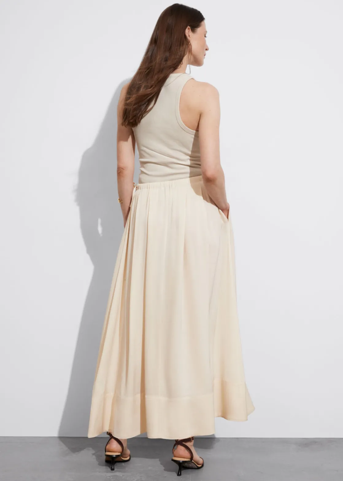 A-line midi skirt featuring a pleated finish and a drawstring waistline.