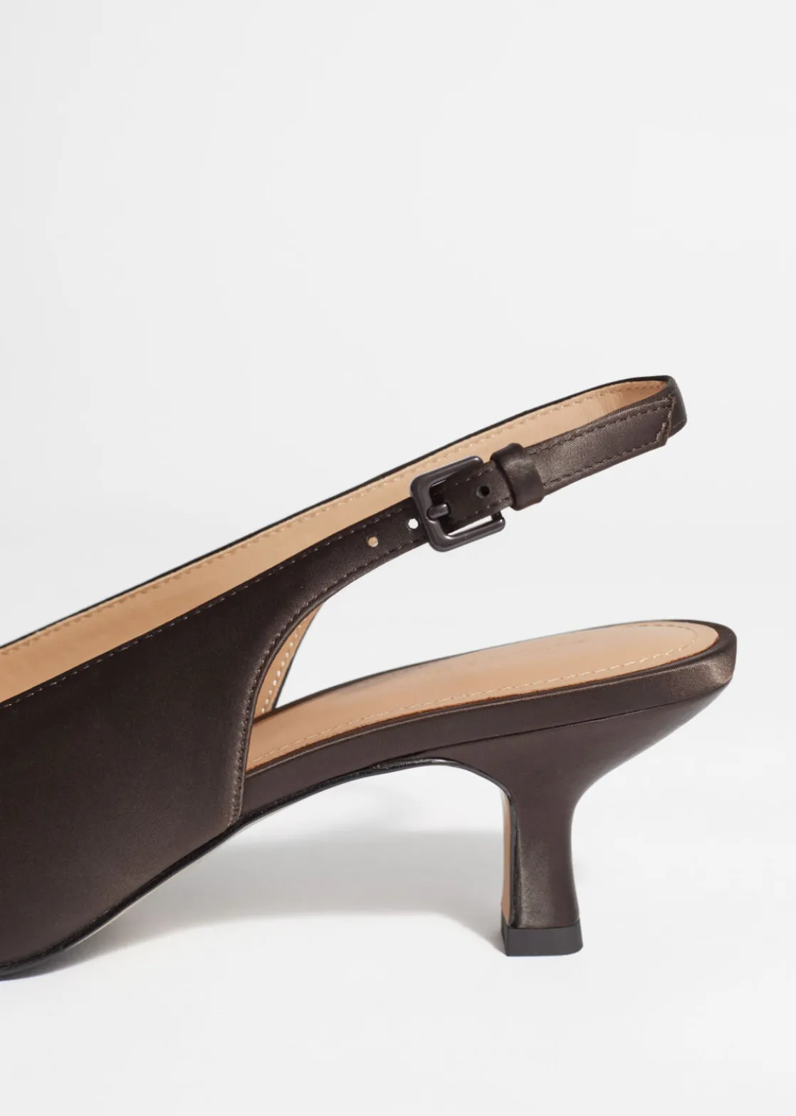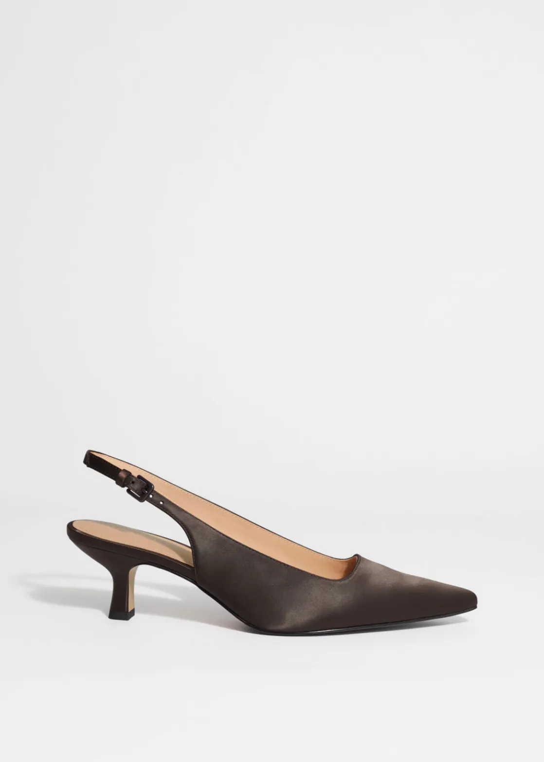 Pointed pumps featuring an adjustable slingback strap and a slim ’90s style kitten heel.