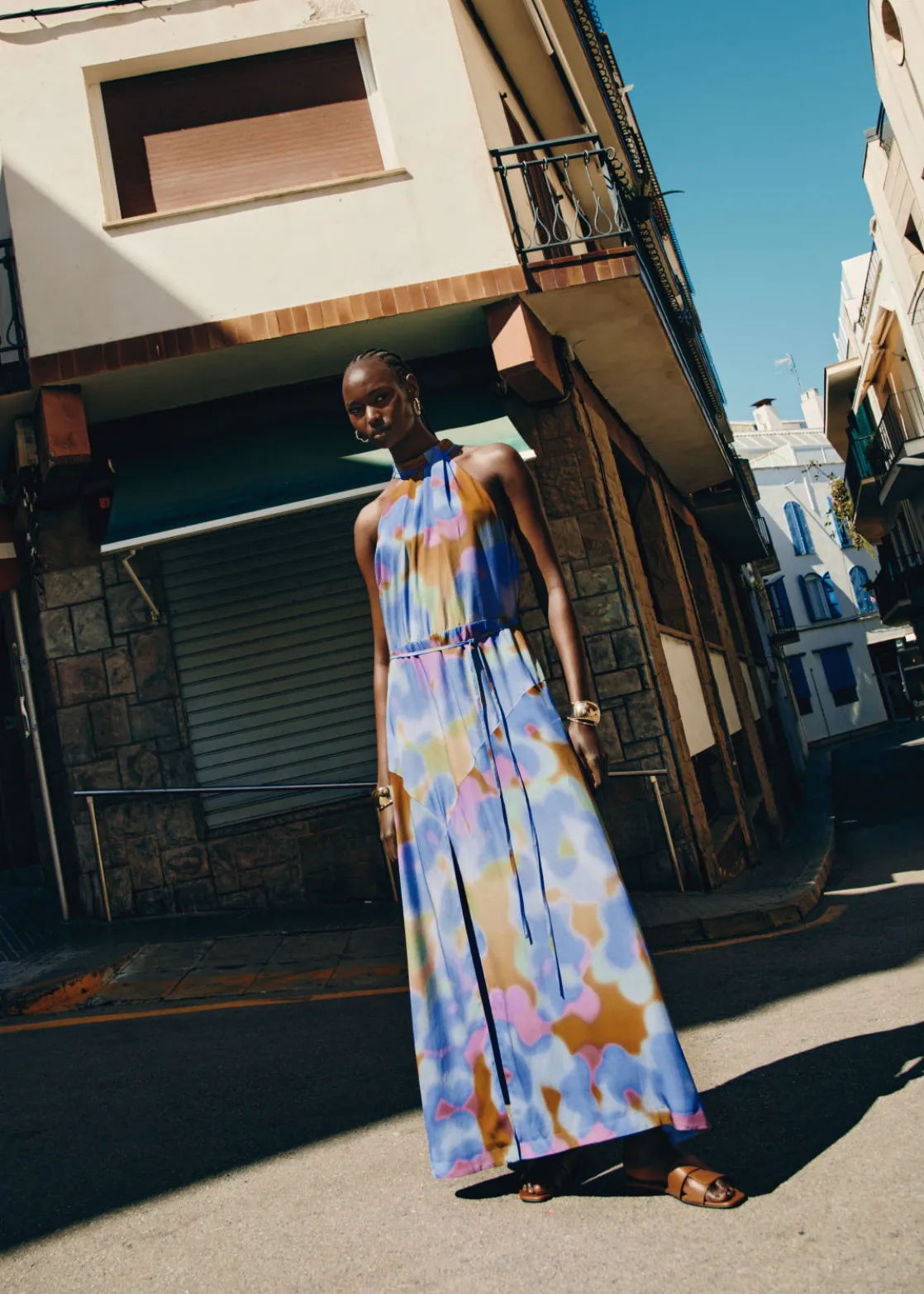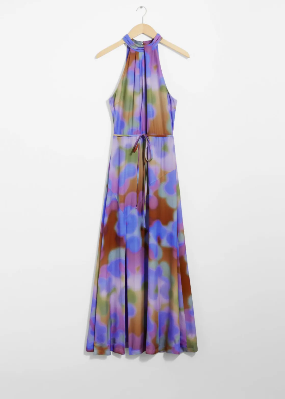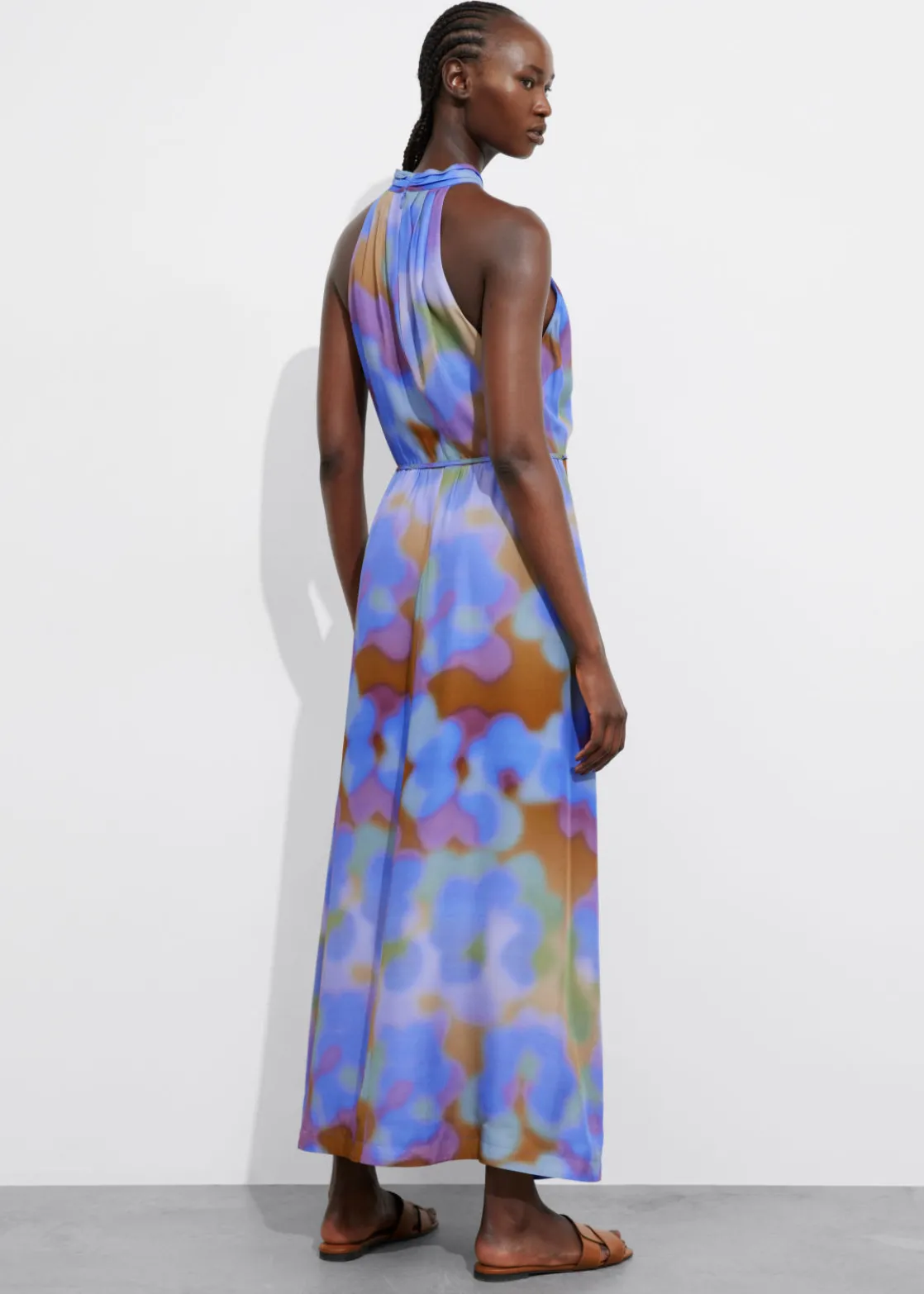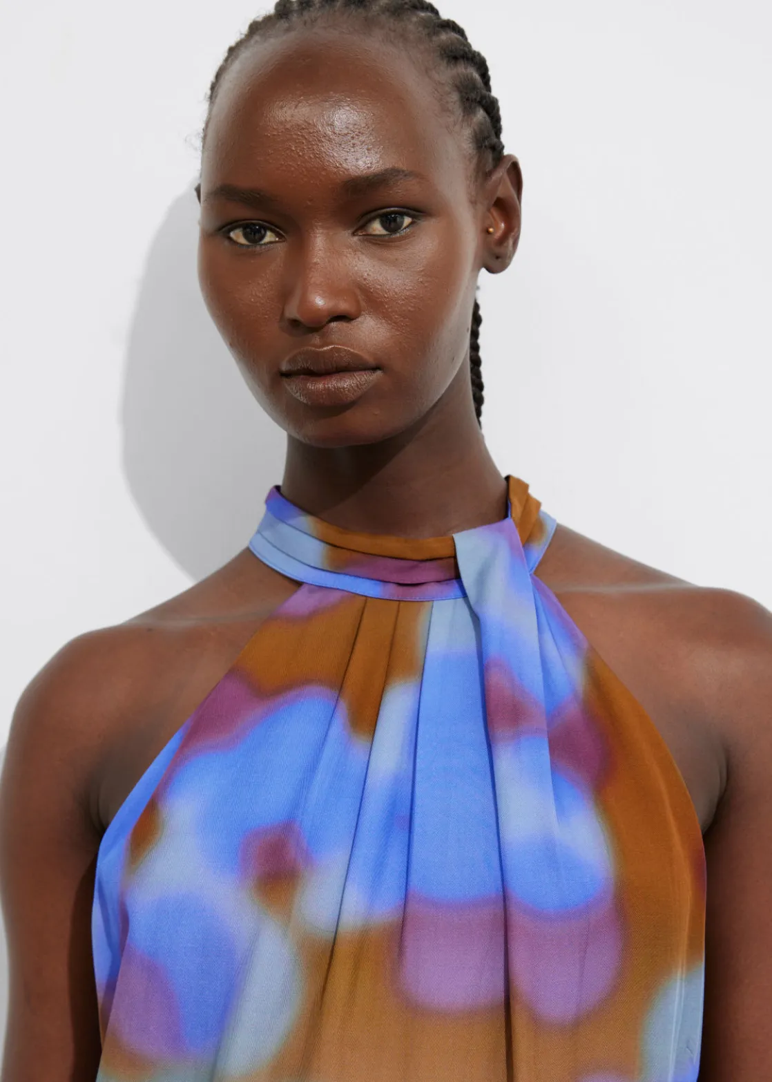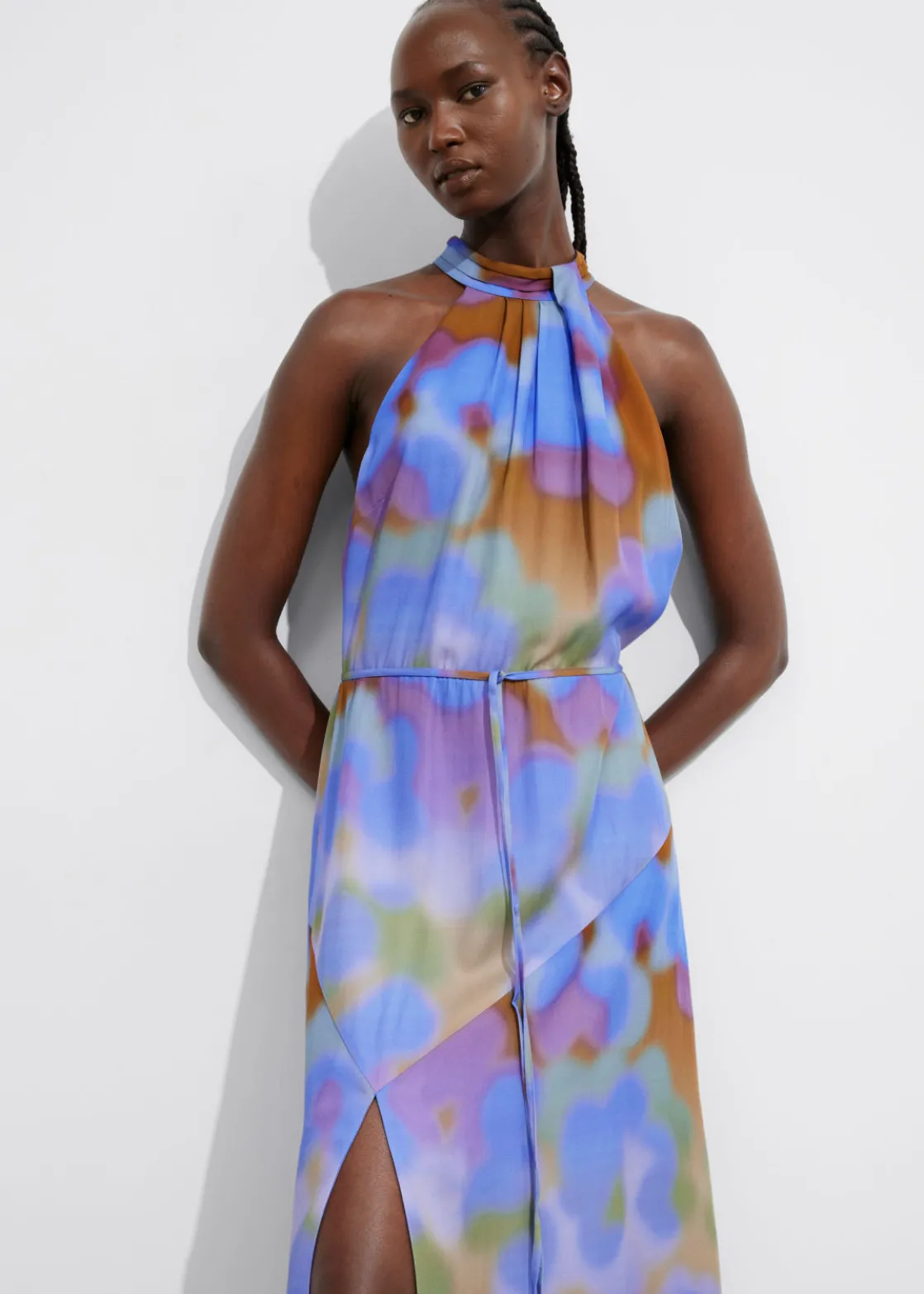 Halterneck maxi dress featuring an abstract print. Finished with pleated detailing at the chest and a front slit.