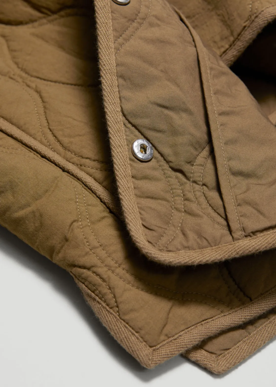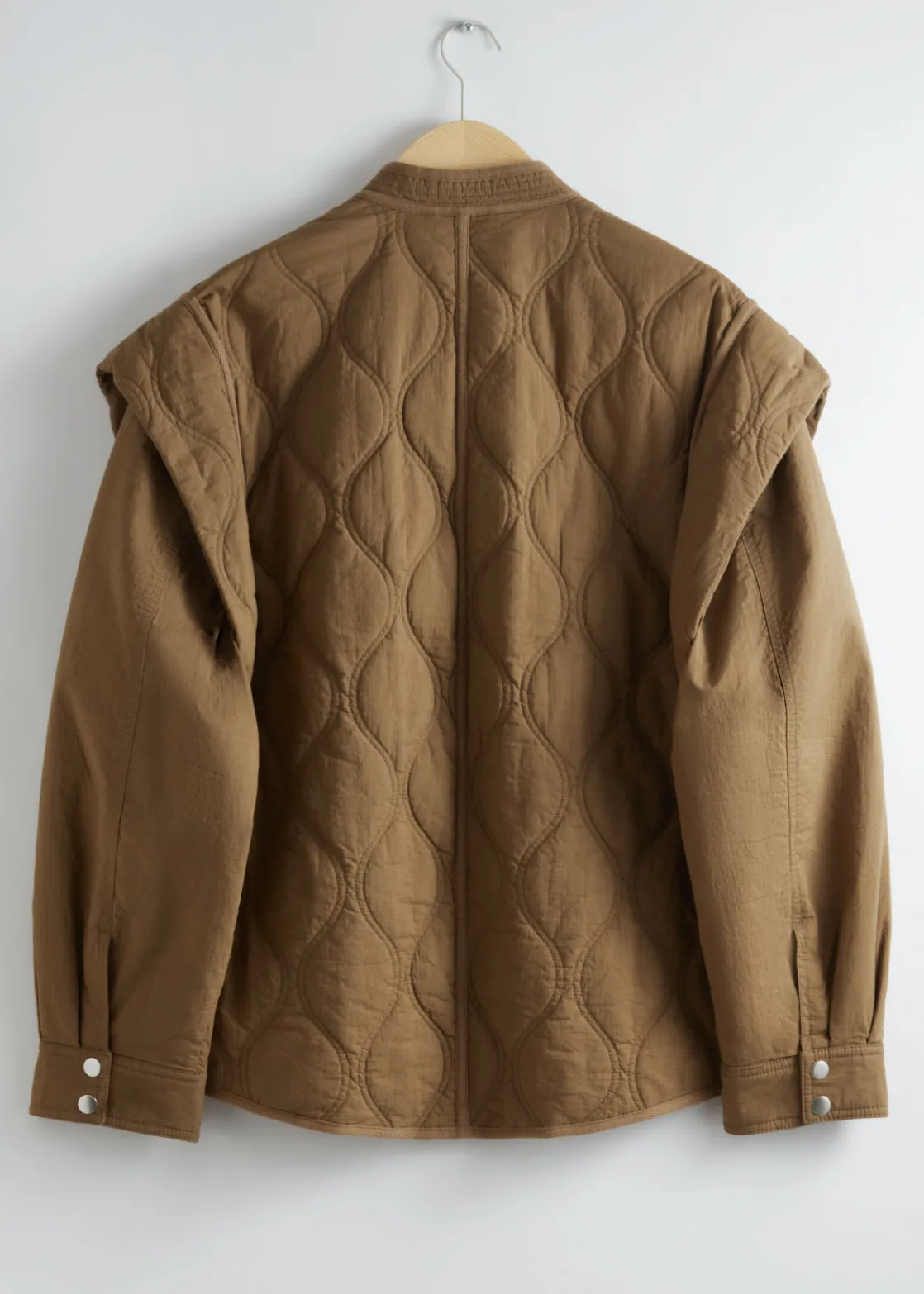 Padded jacket featuring a curved, quilted finish and extended shoulders. Traced with press button closures.