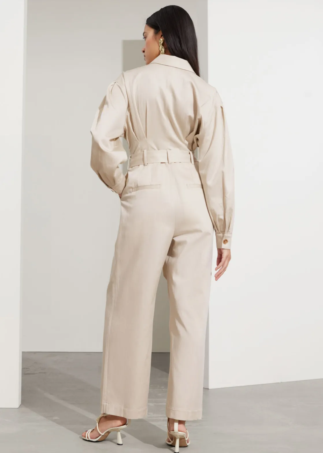 Collared jumpsuit featuring a straight silhouette. Secured with a tonal self-tie belt.