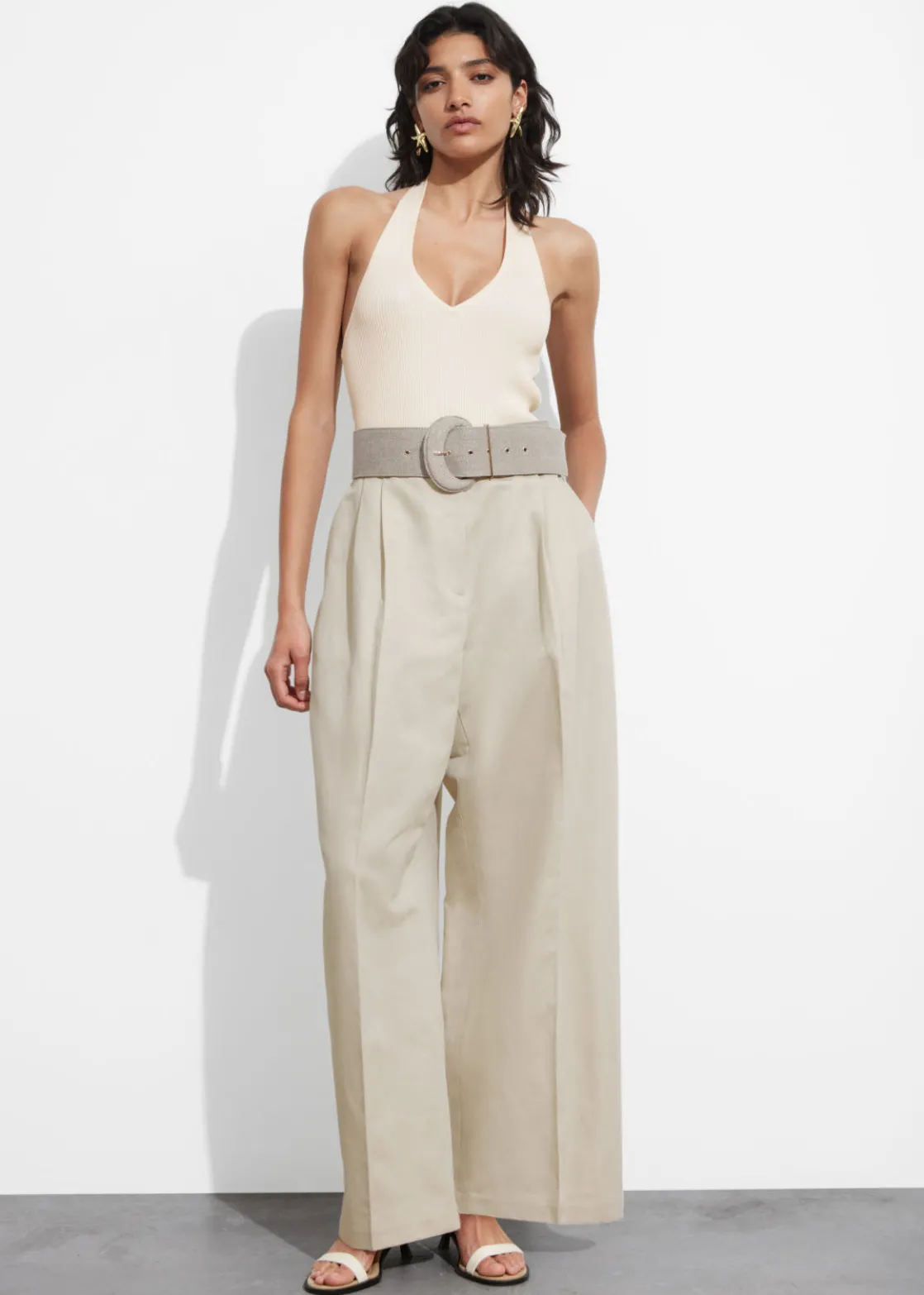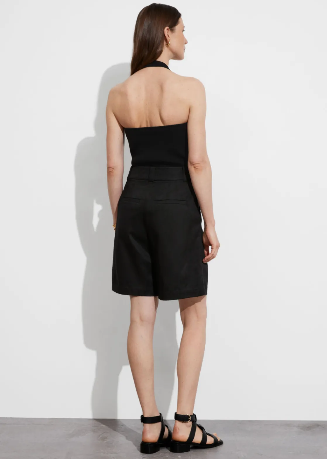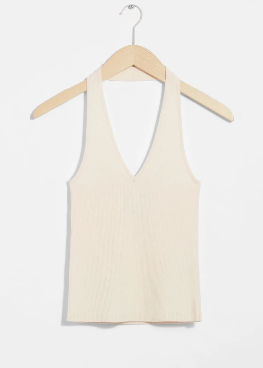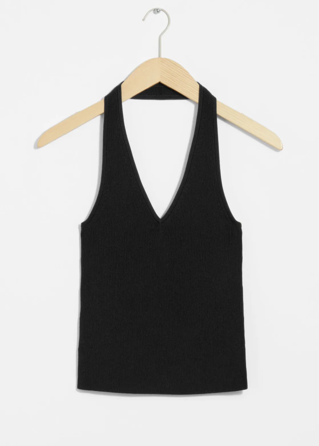 Halterneck top with a ribbed finish, a v-cut neckline and an open back.