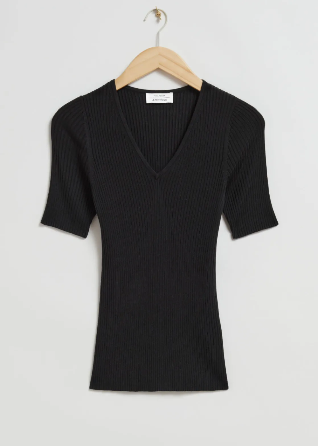 Ribbed t-shirt crafted from a soft, silky textured fabric. Designed with a v-cut neckline and short sleeves enhanced with a plain knit ribbed finish in a form-fitting silhouette.