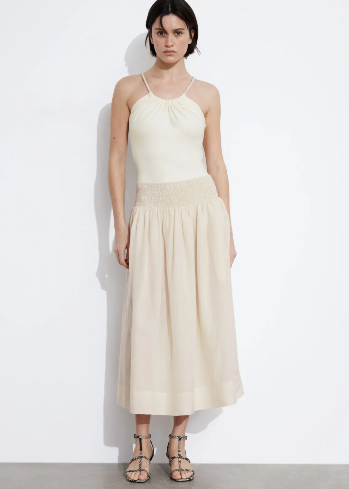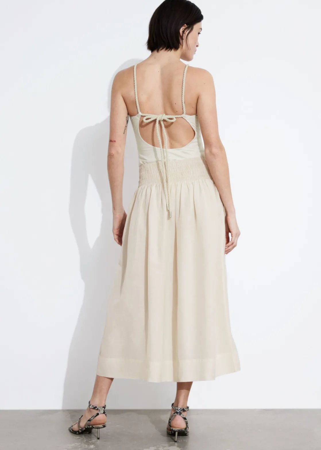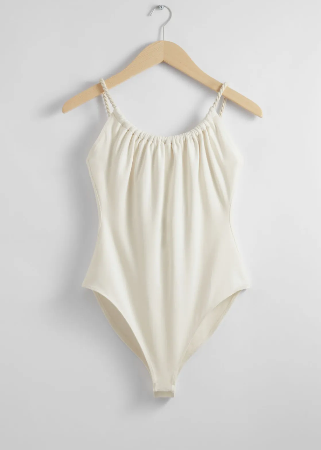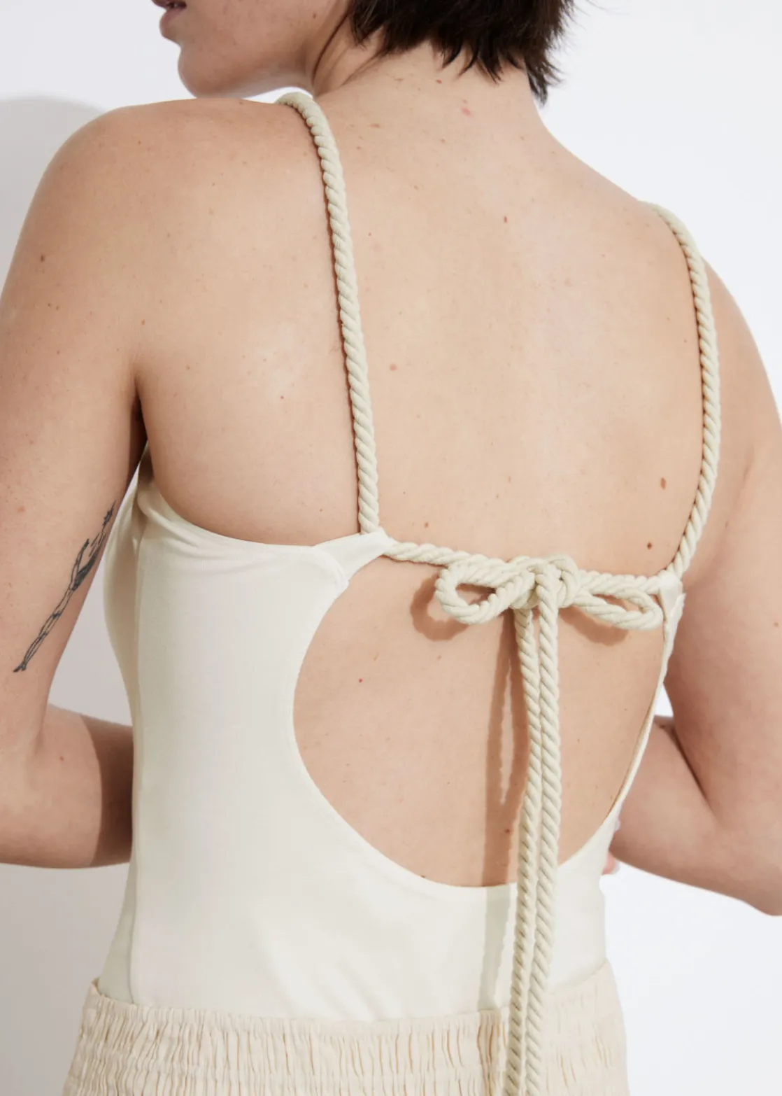 Sleeveless bodysuit featuring rope-inspired shoulder straps that ties at the back.