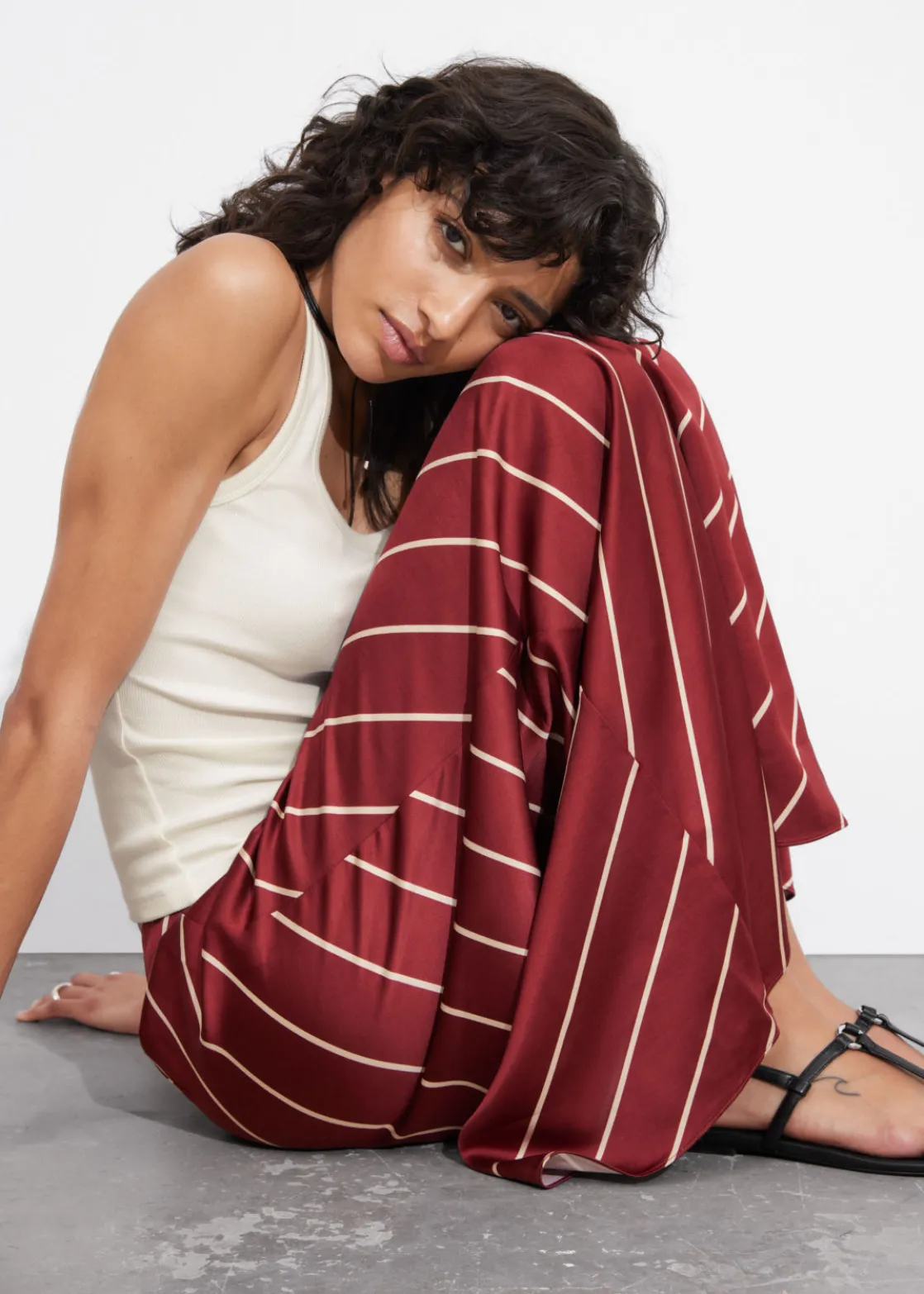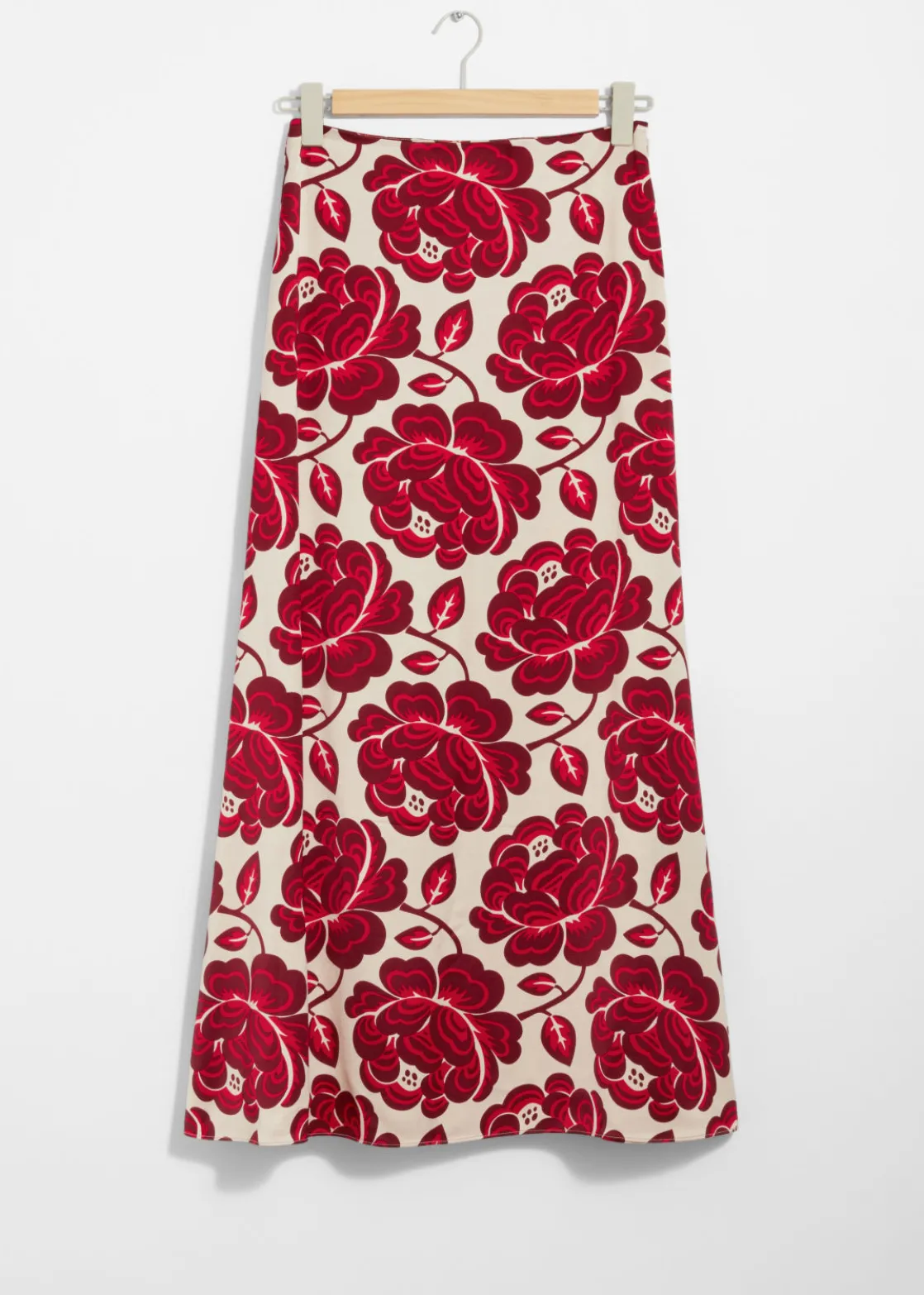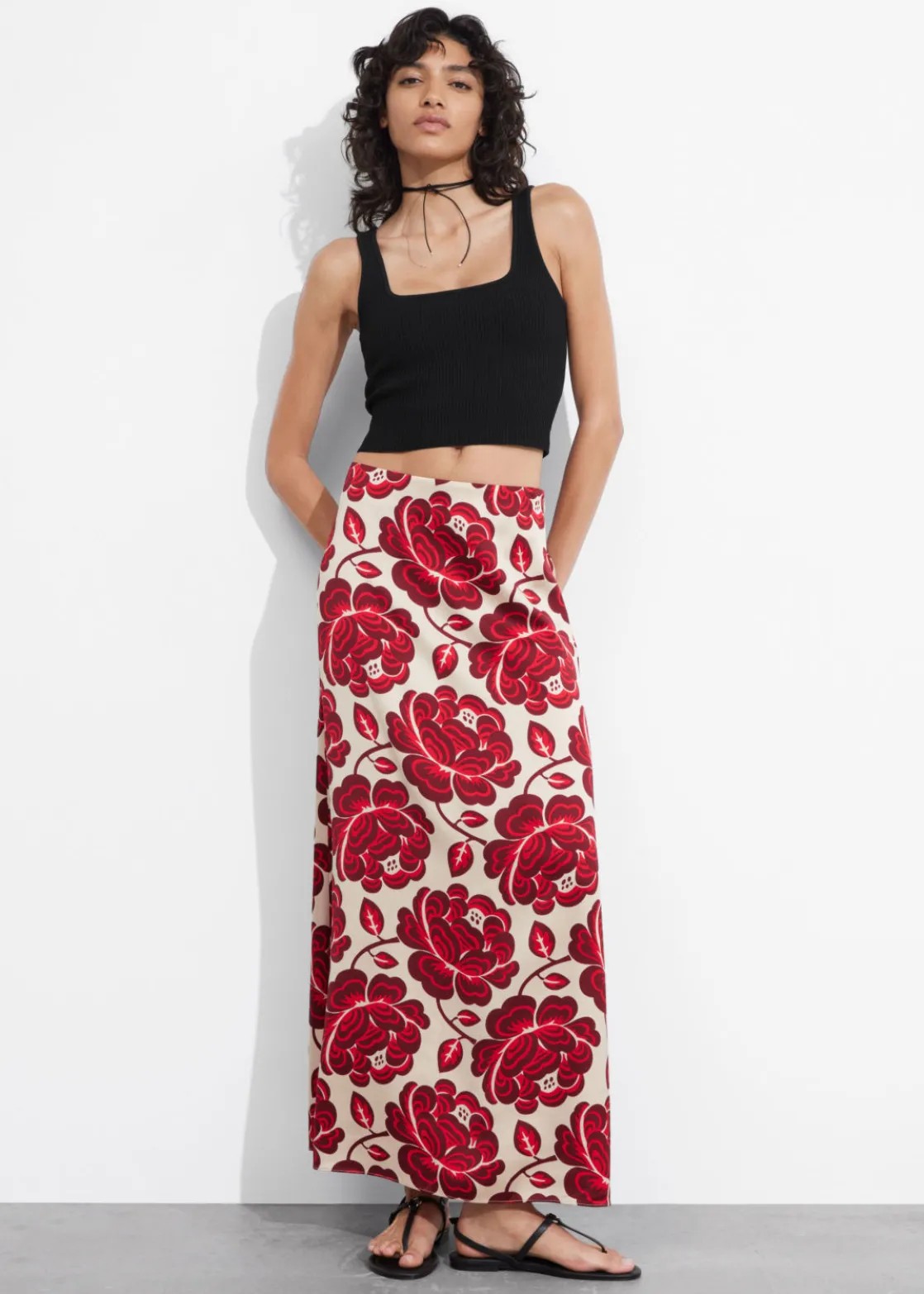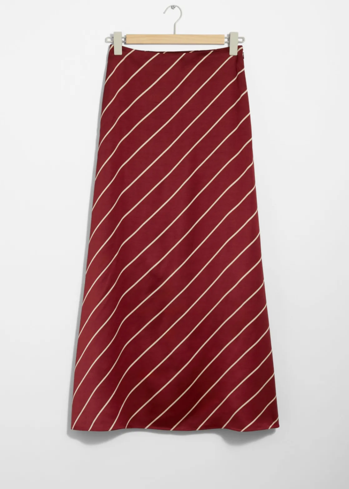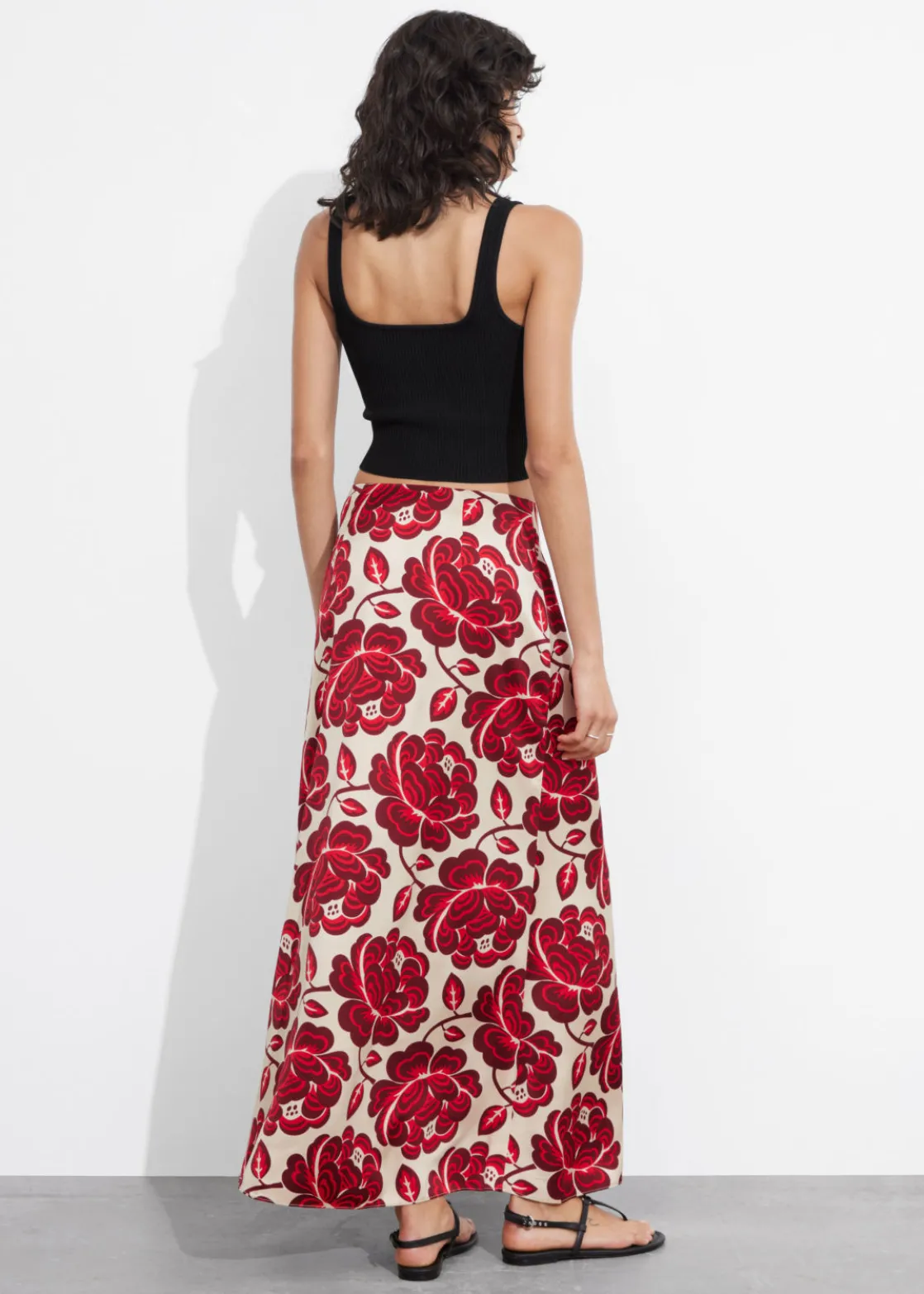 High-waist satin maxi skirt featuring an A-line silhouette. Secured with a zipper at the side.