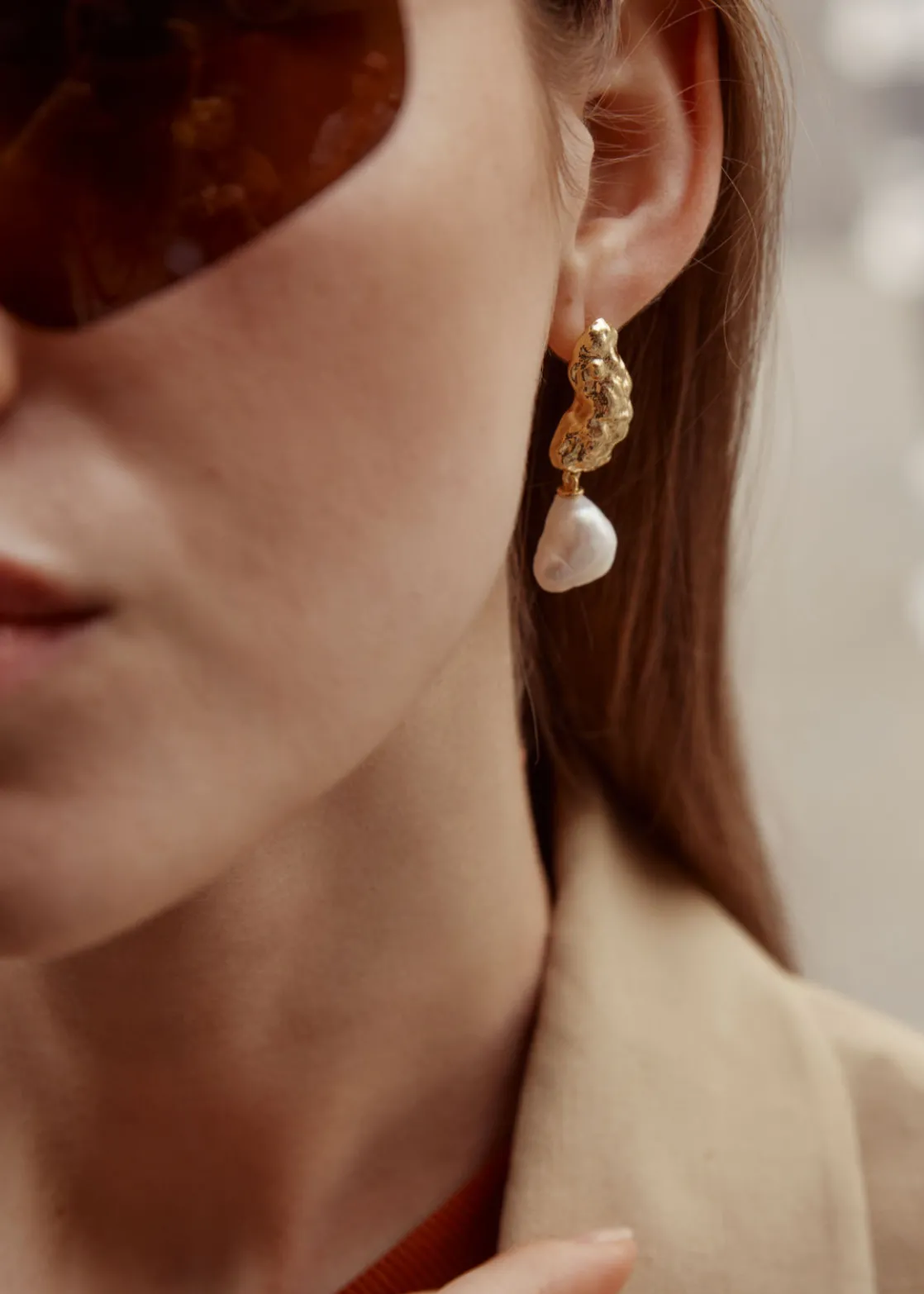 Cast from gold-plated brass, these drop earrings are designed in an organic shape and set with freshwater pearls at the base.
