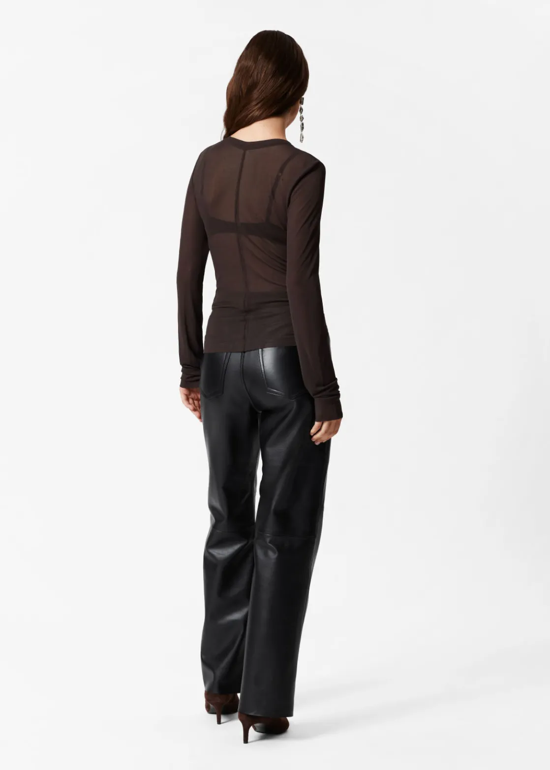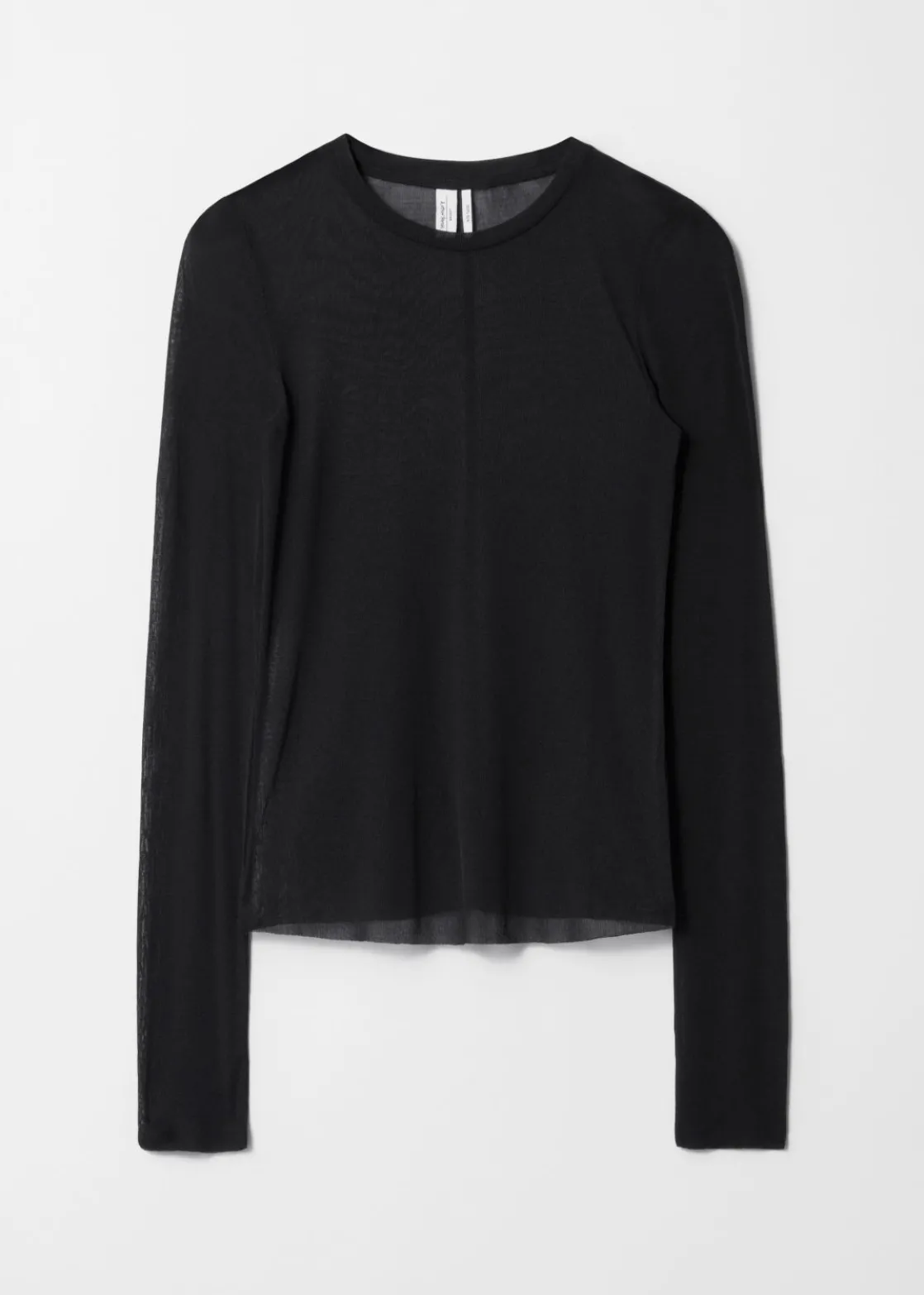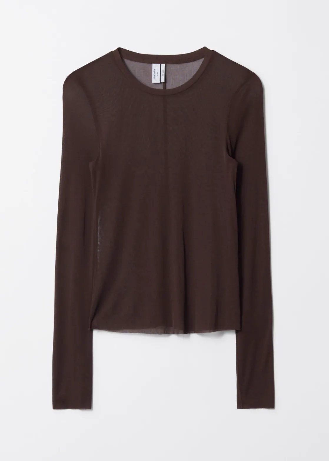 Long-sleeve top crafted from sumptous mulberry silk. Featuring a sheer finish.