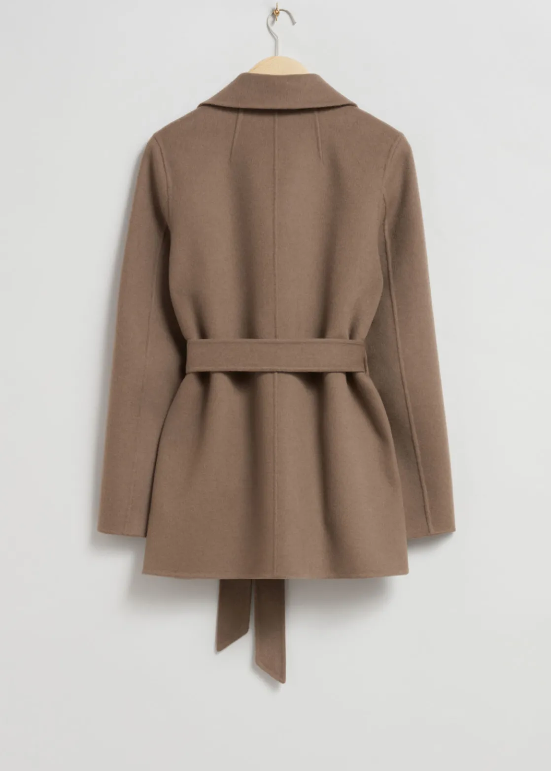 Short wool-blend coat secured with a tonal self-tie belt.