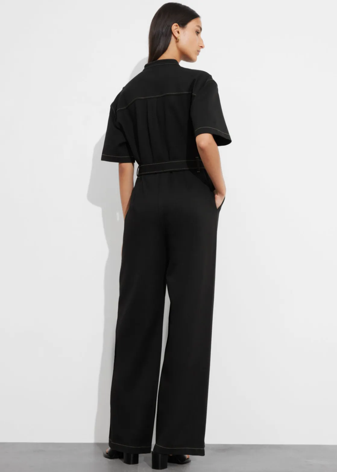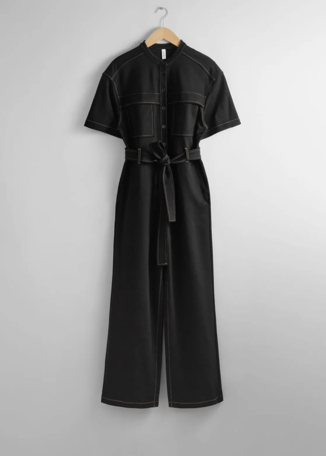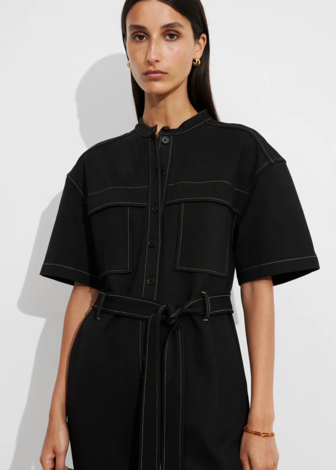 Short-sleeve jumpsuit featuring a utility-inspired finish with contrasting stitching. Secured with a self-tie belt.