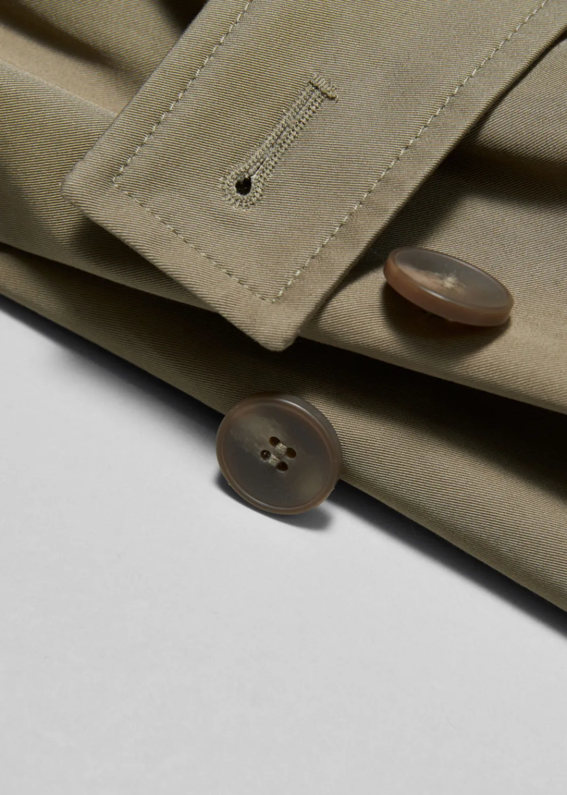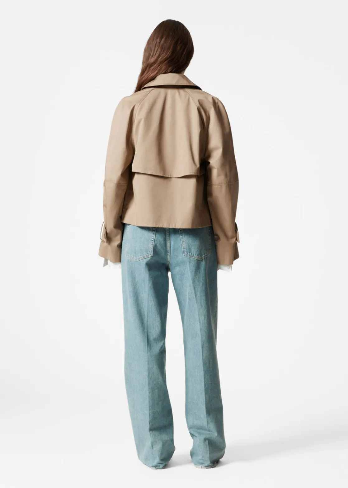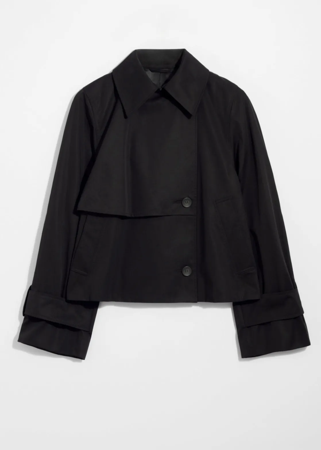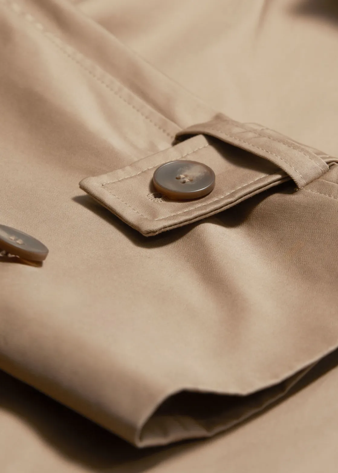 Collared jacket with trenchcoat-inspired finish, featuring an overlapping lapel.