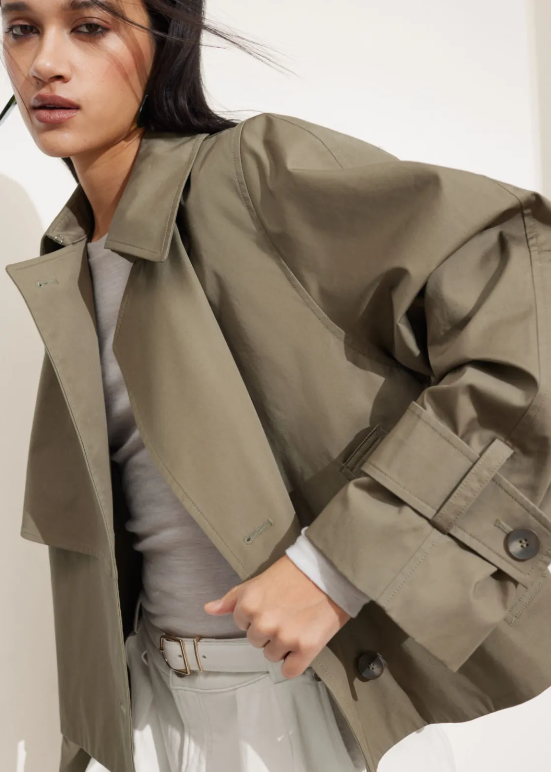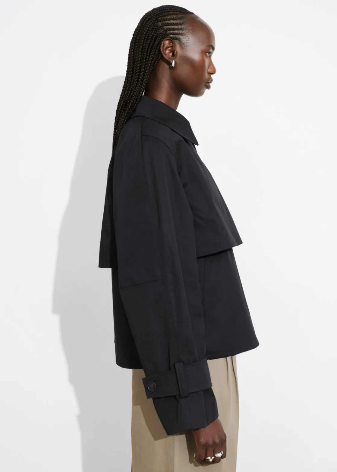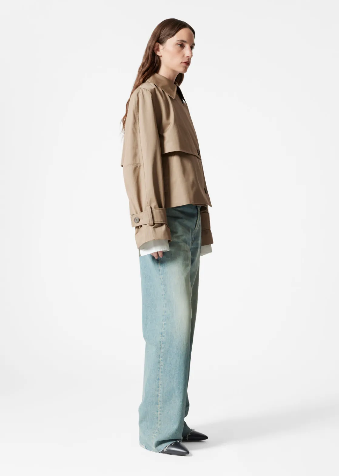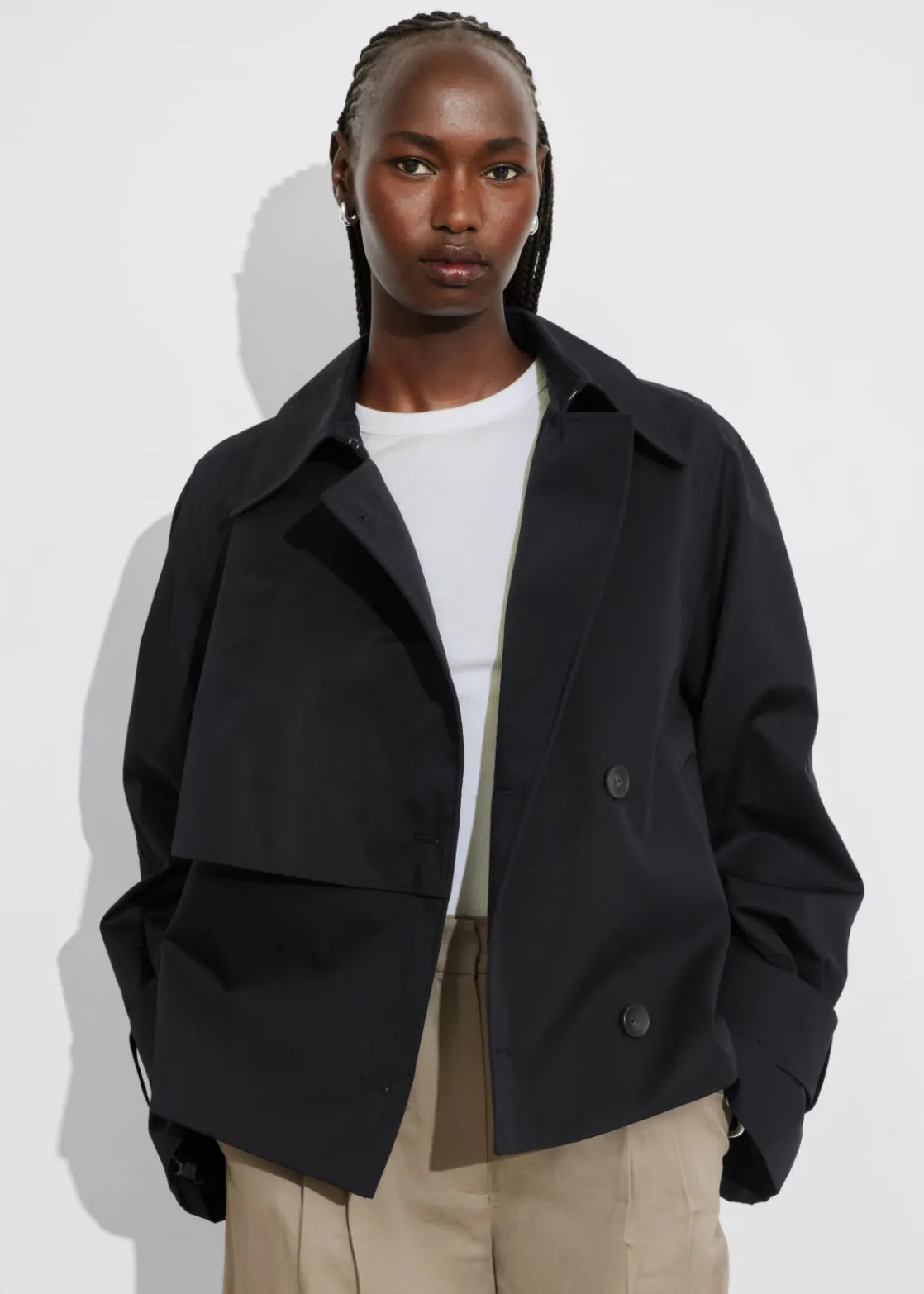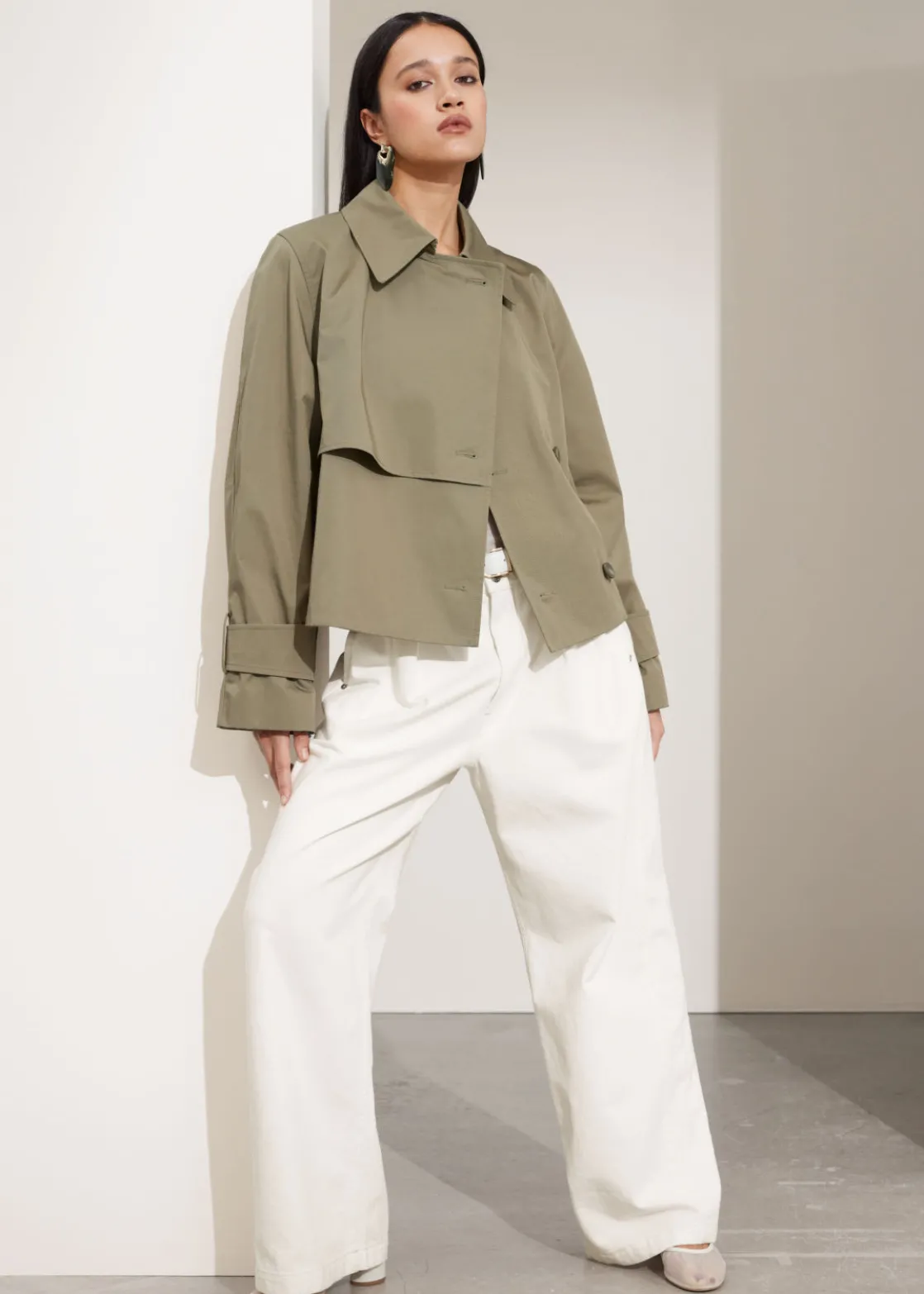 Collared jacket with trenchcoat-inspired finish, featuring an overlapping lapel.