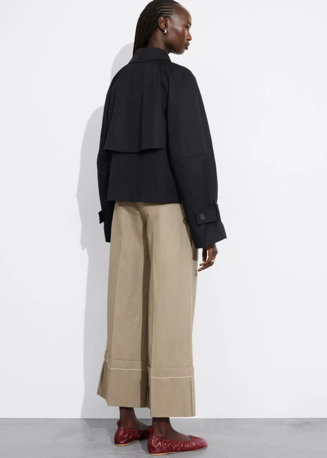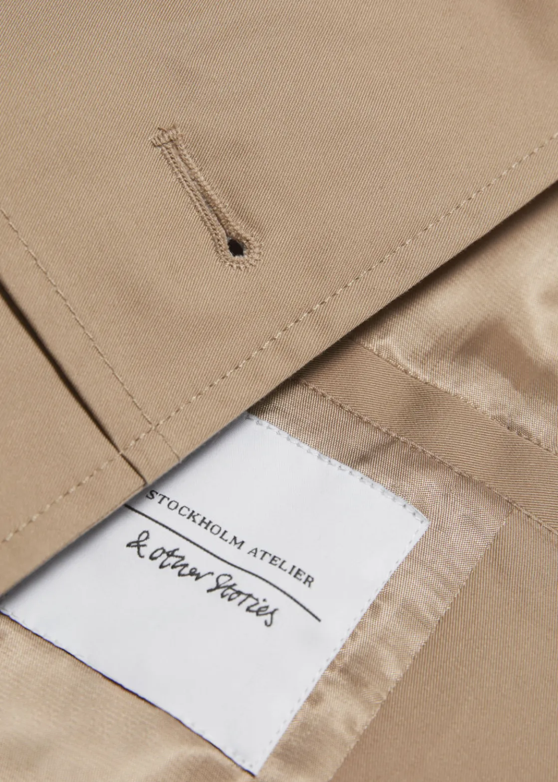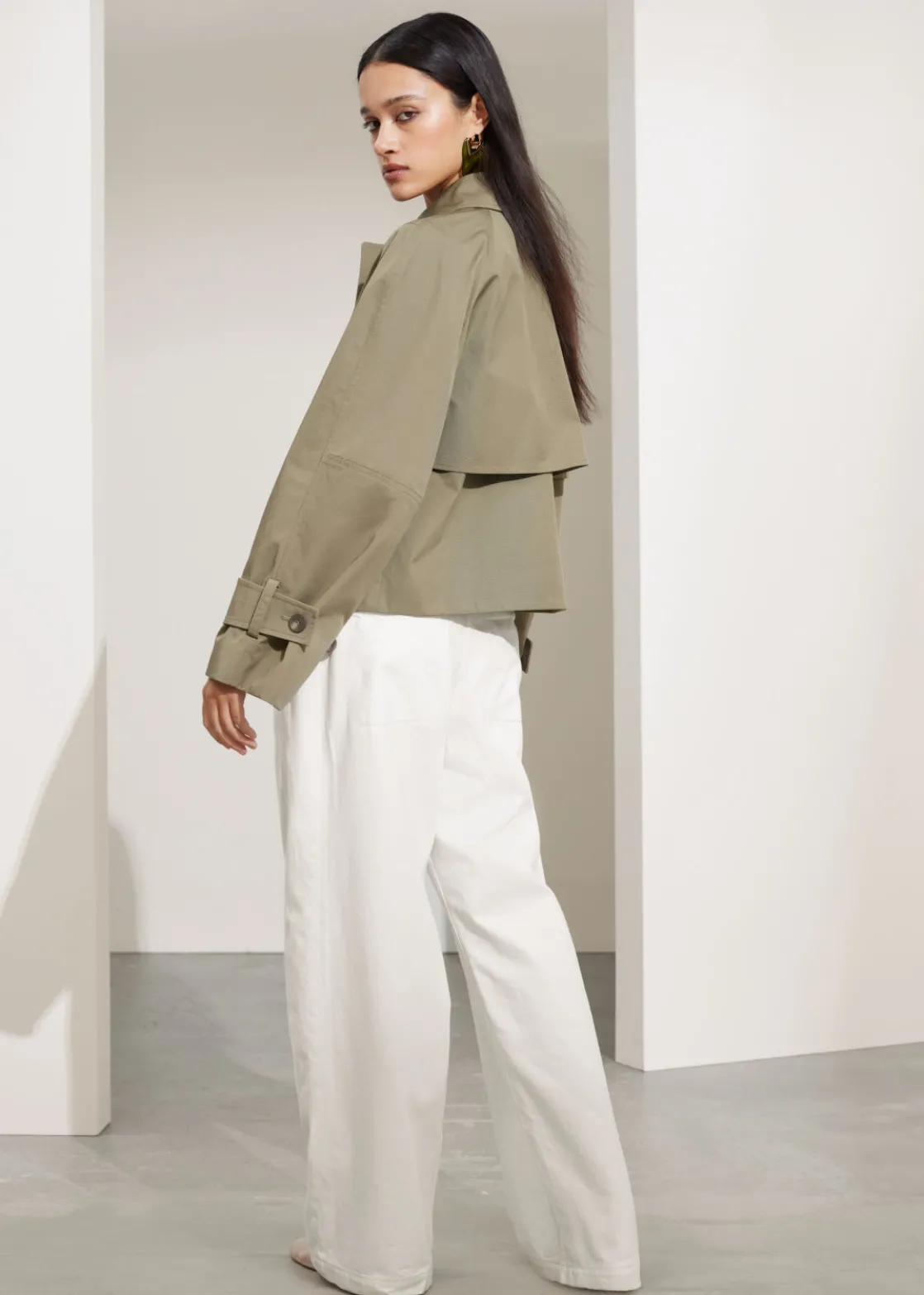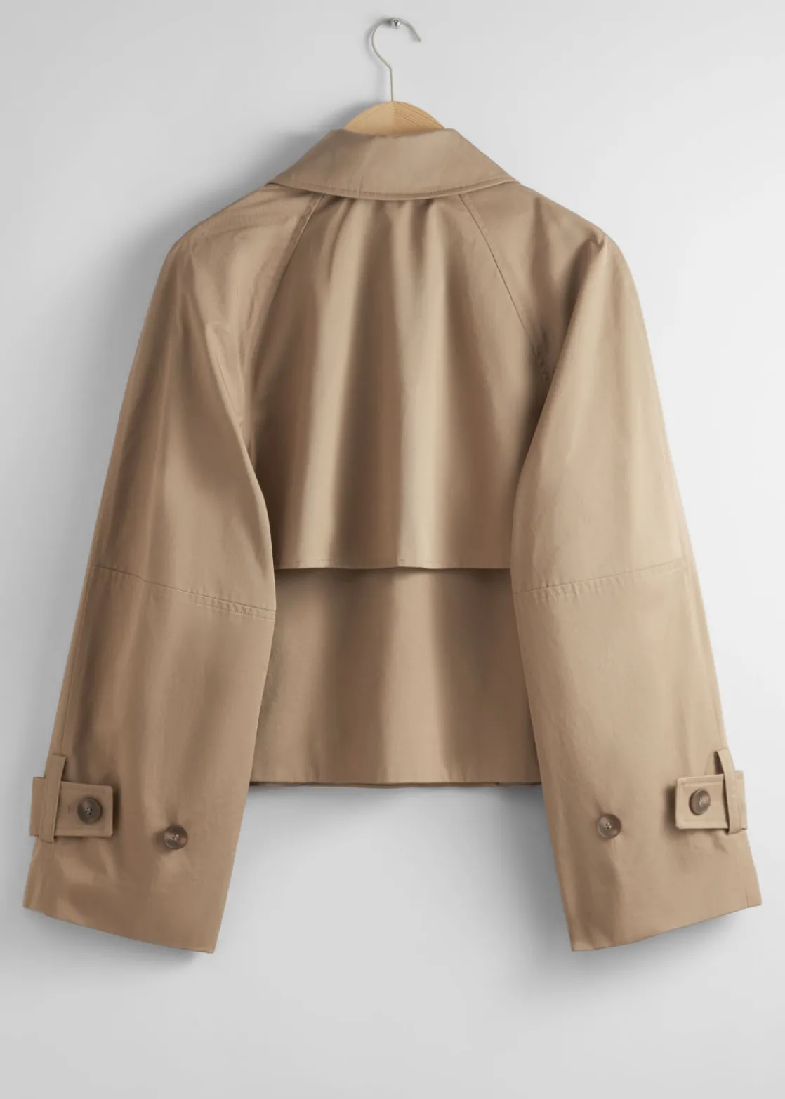 Collared jacket with trenchcoat-inspired finish, featuring an overlapping lapel.