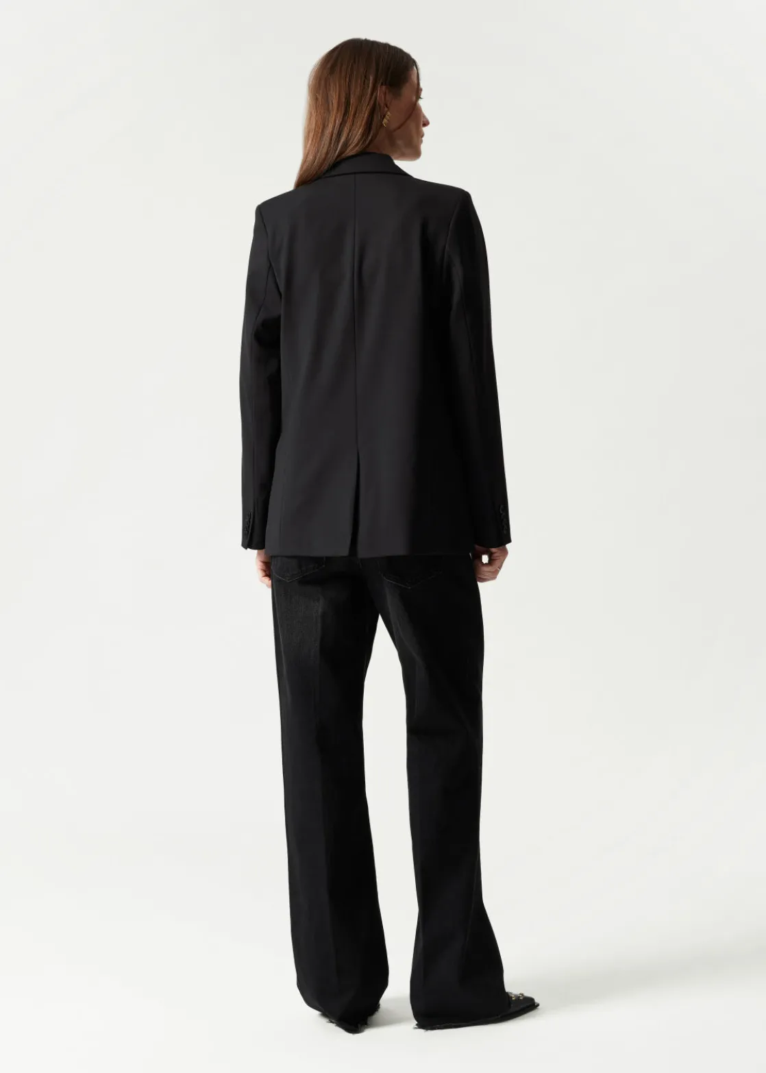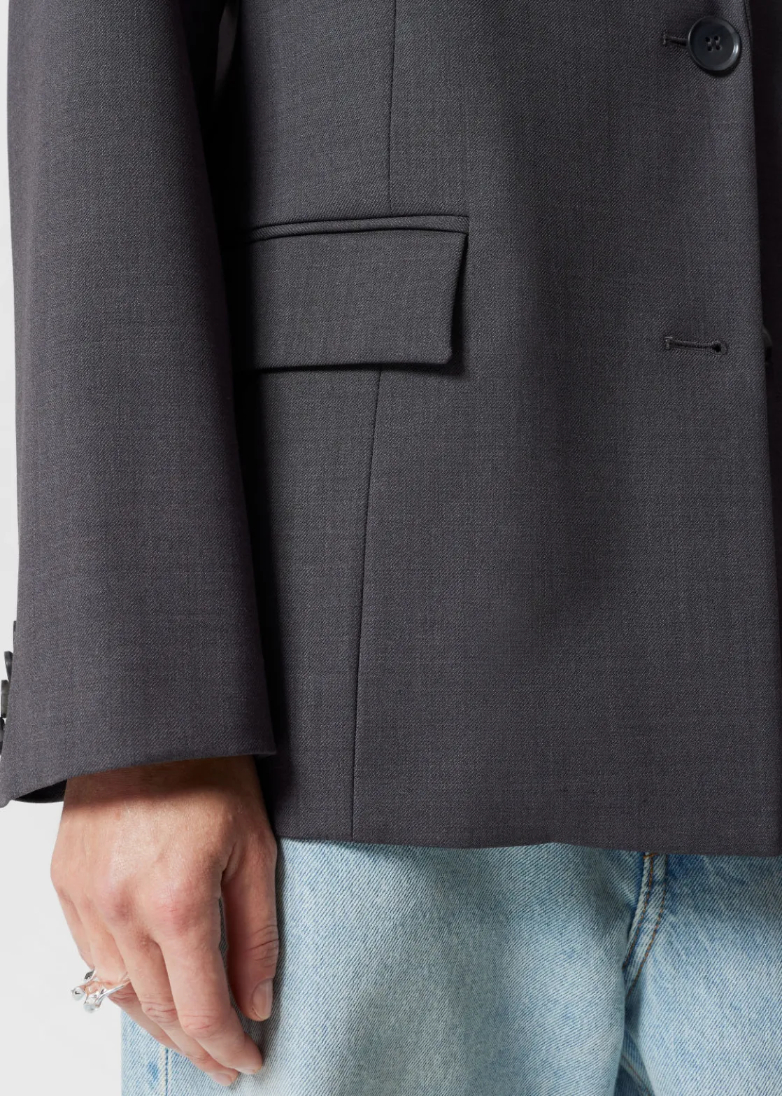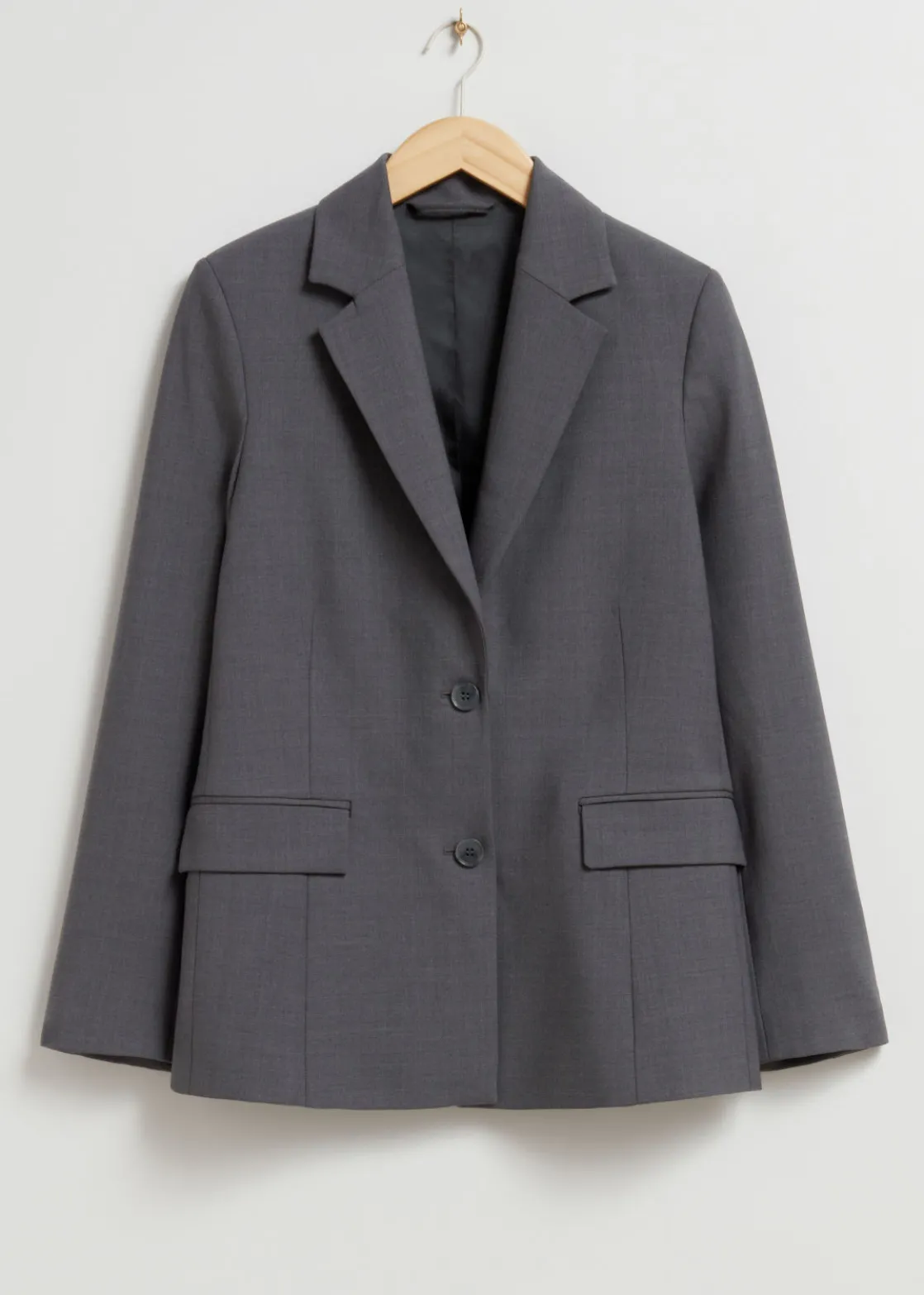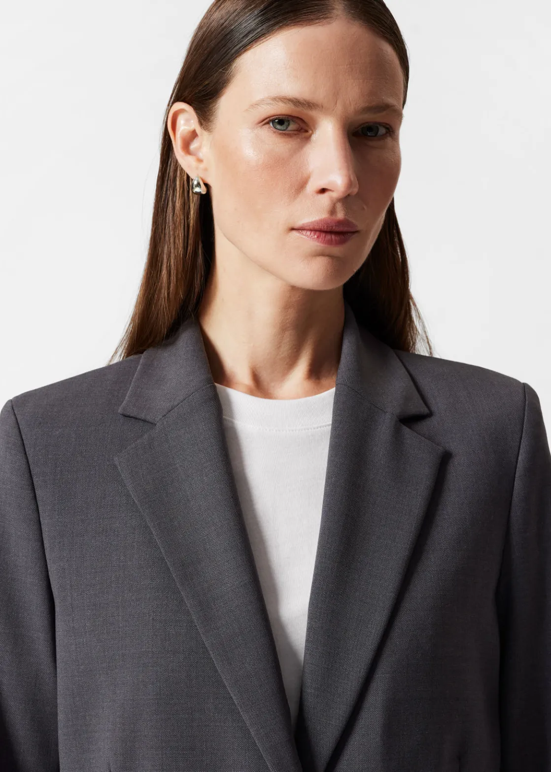 Wool-blend blazer designed with a notched-lapel collar, a v-cut neckline and buttoned front.