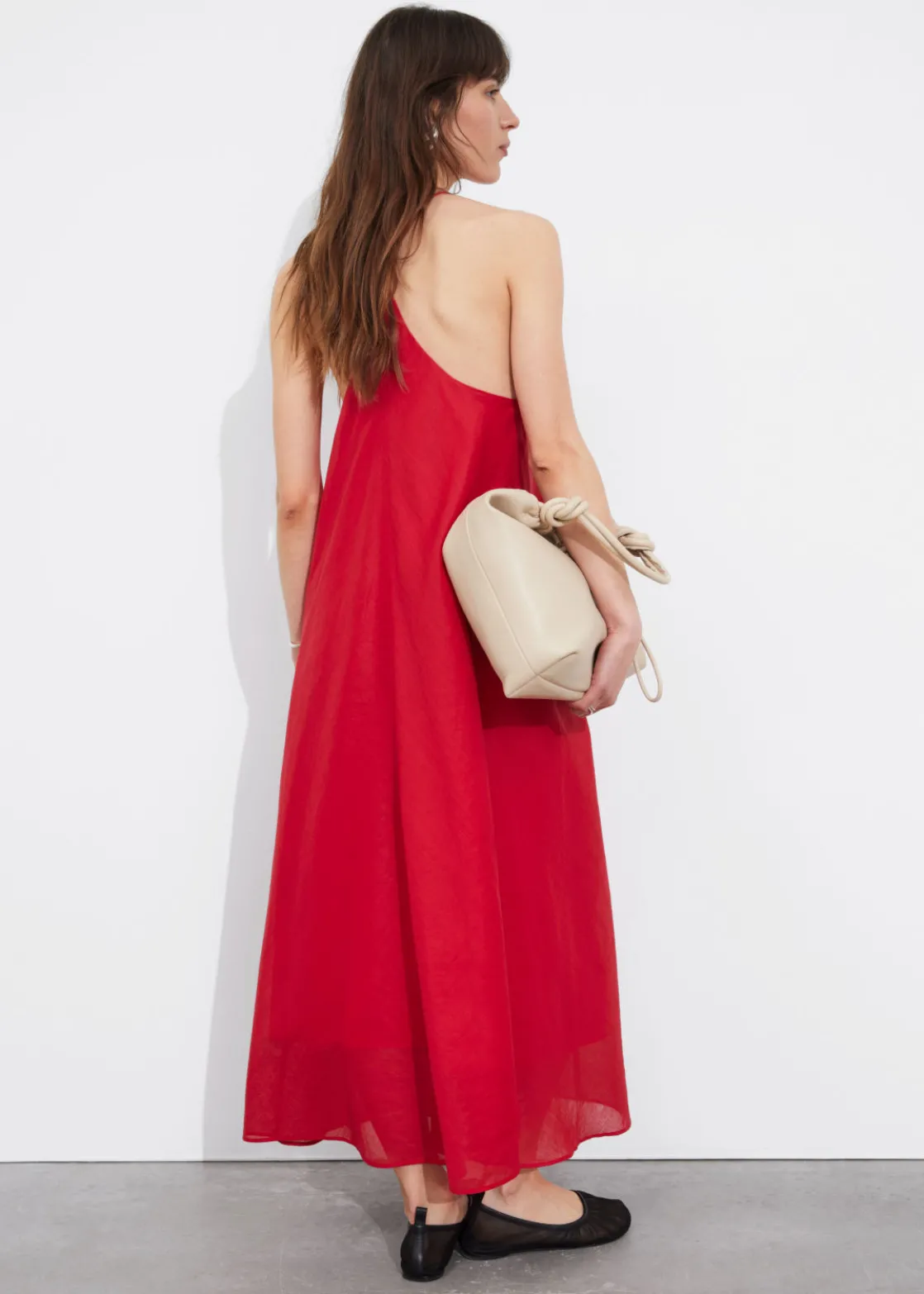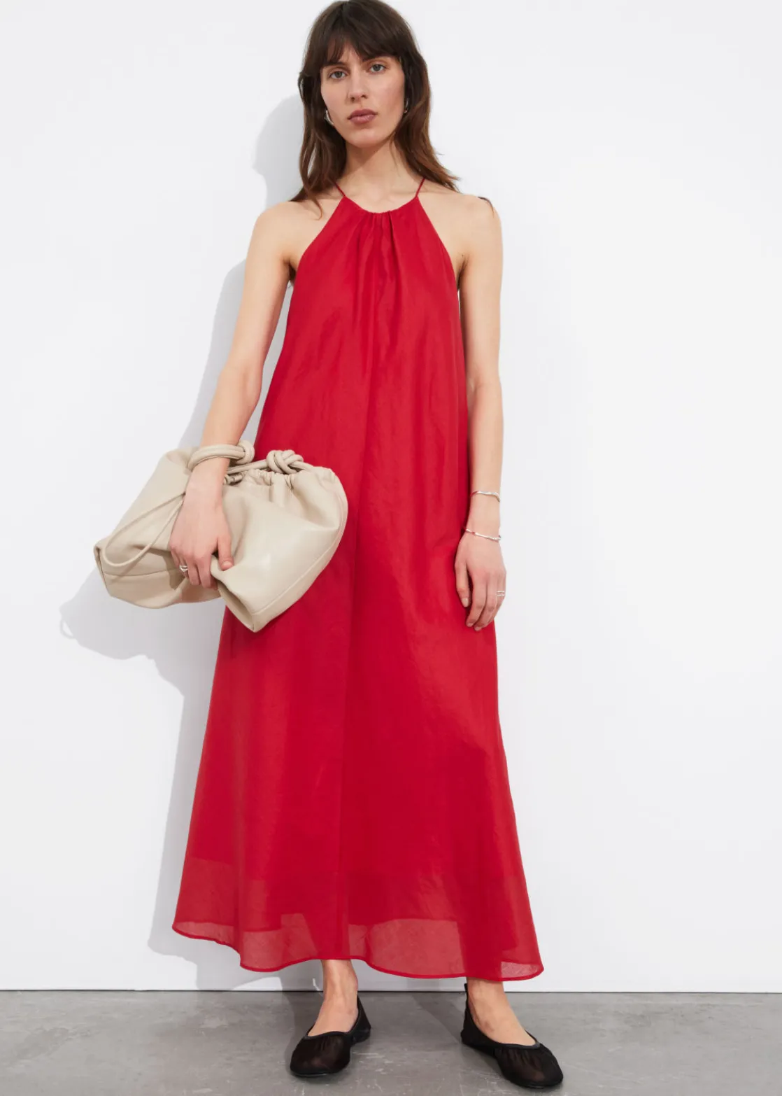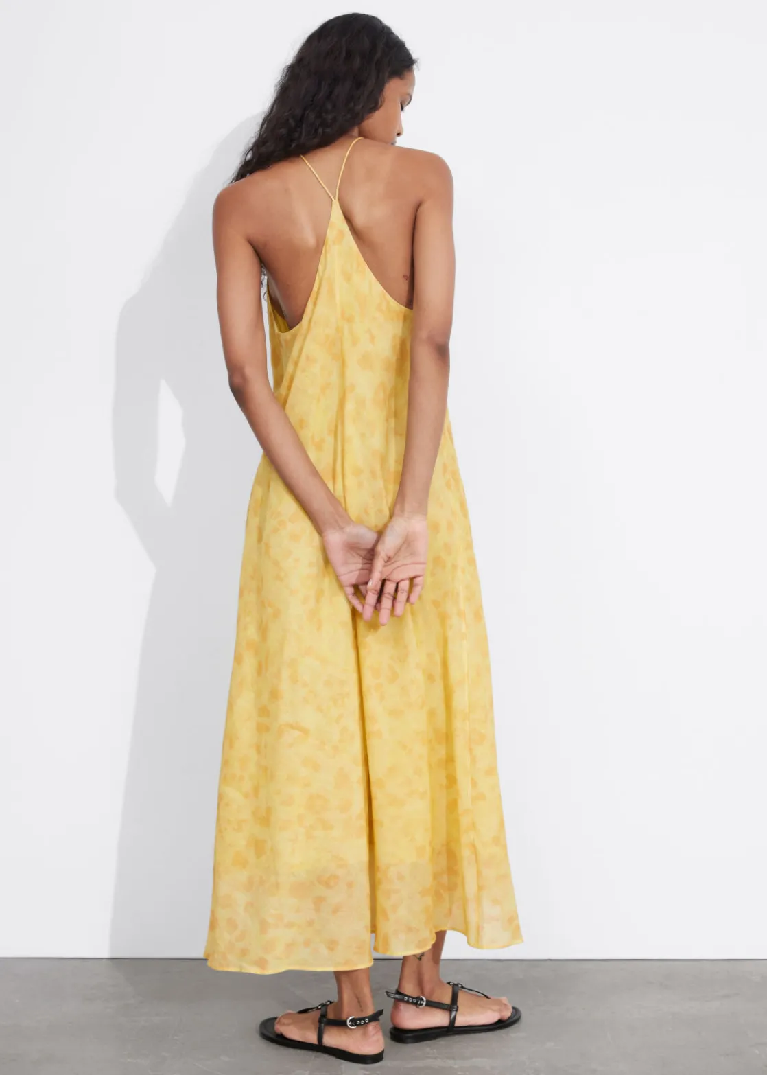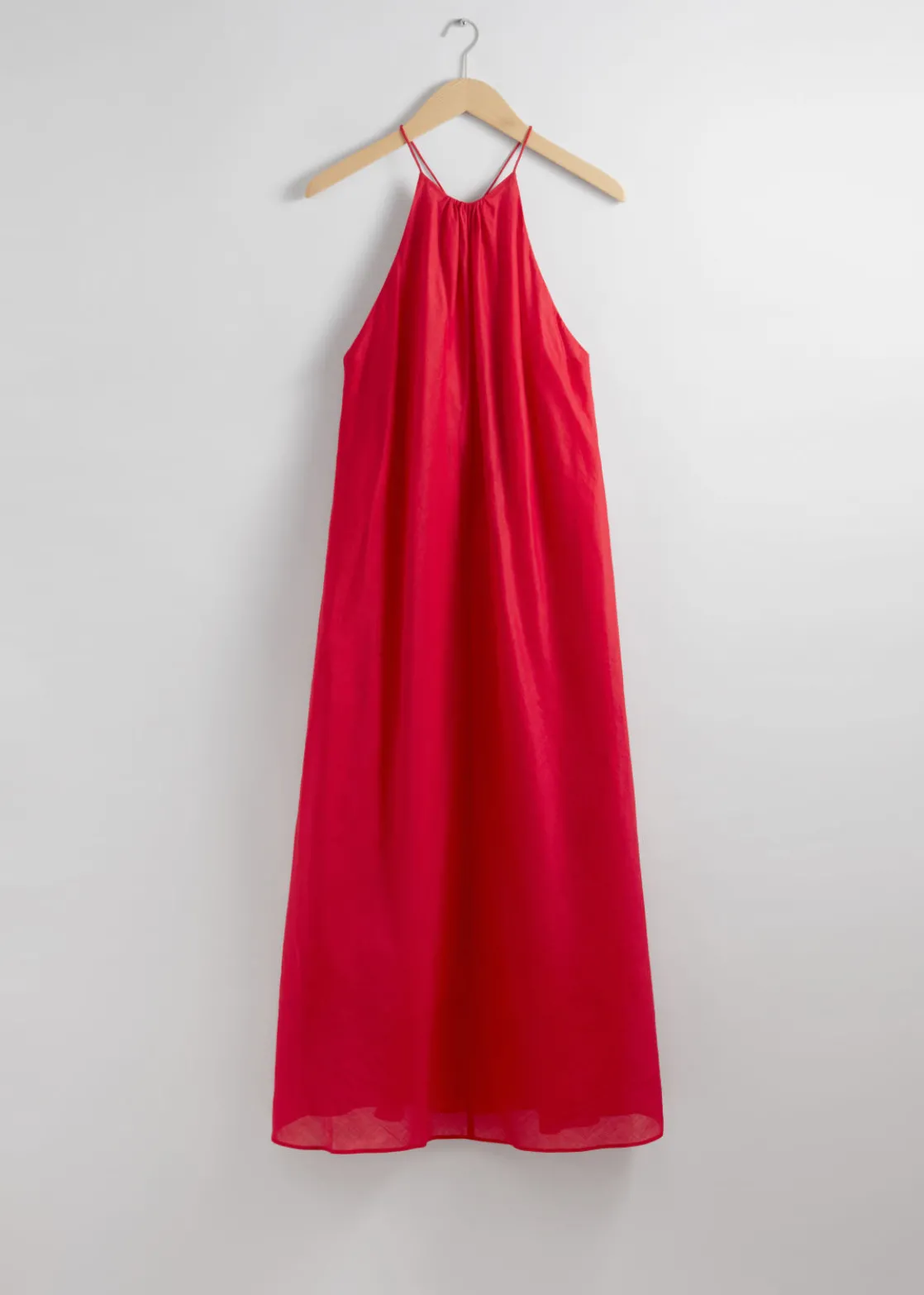 Sleeveless A-line midi dress featuring a halterneck with thin spaghetti straps.