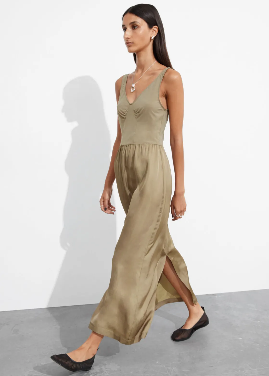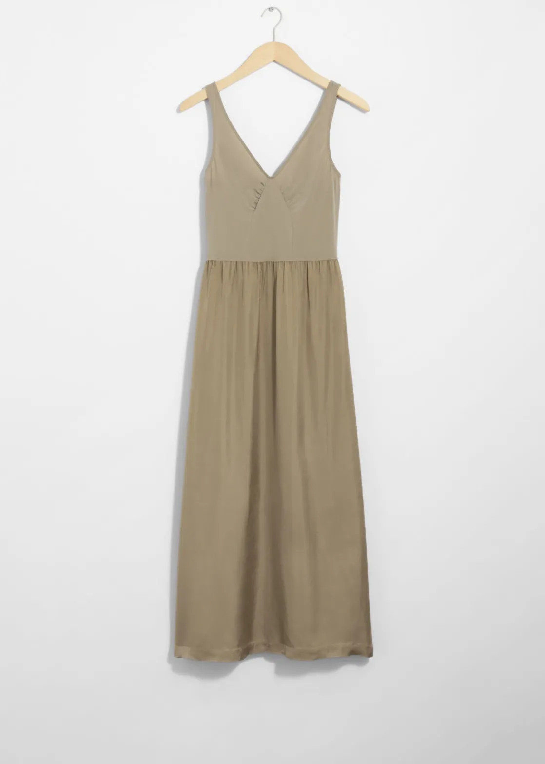 Sleeveless midi dress designed with contrasting, two-tone materials. Featuring gathered detailing at the chest.