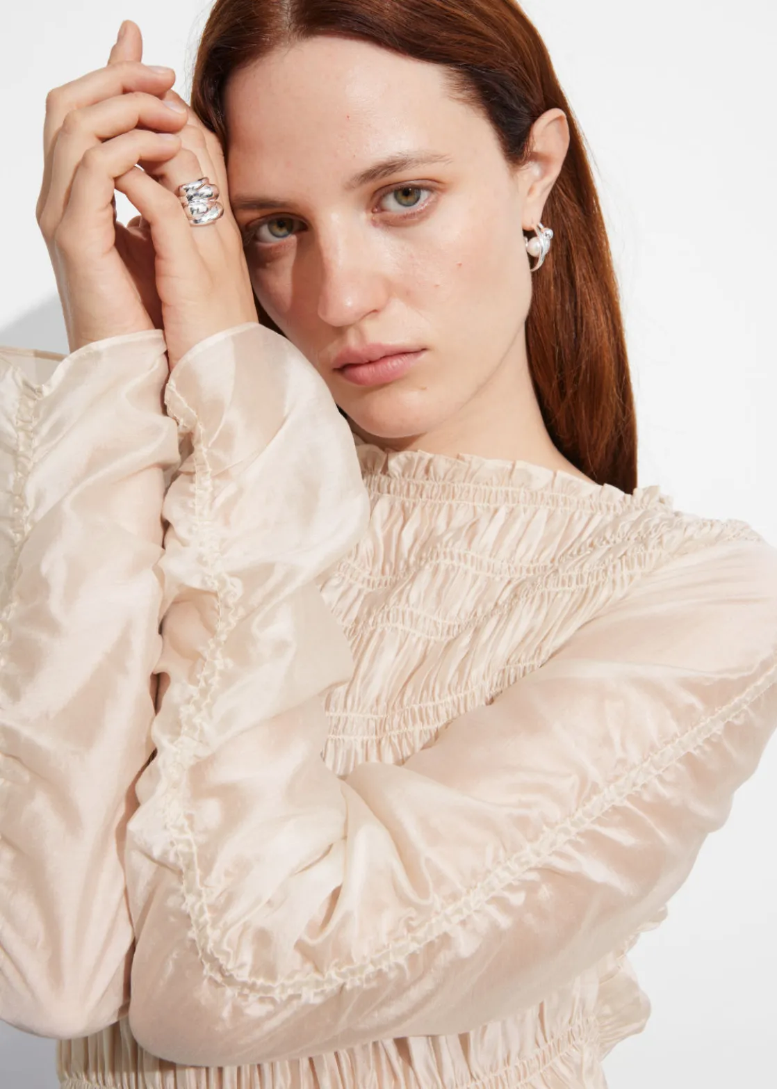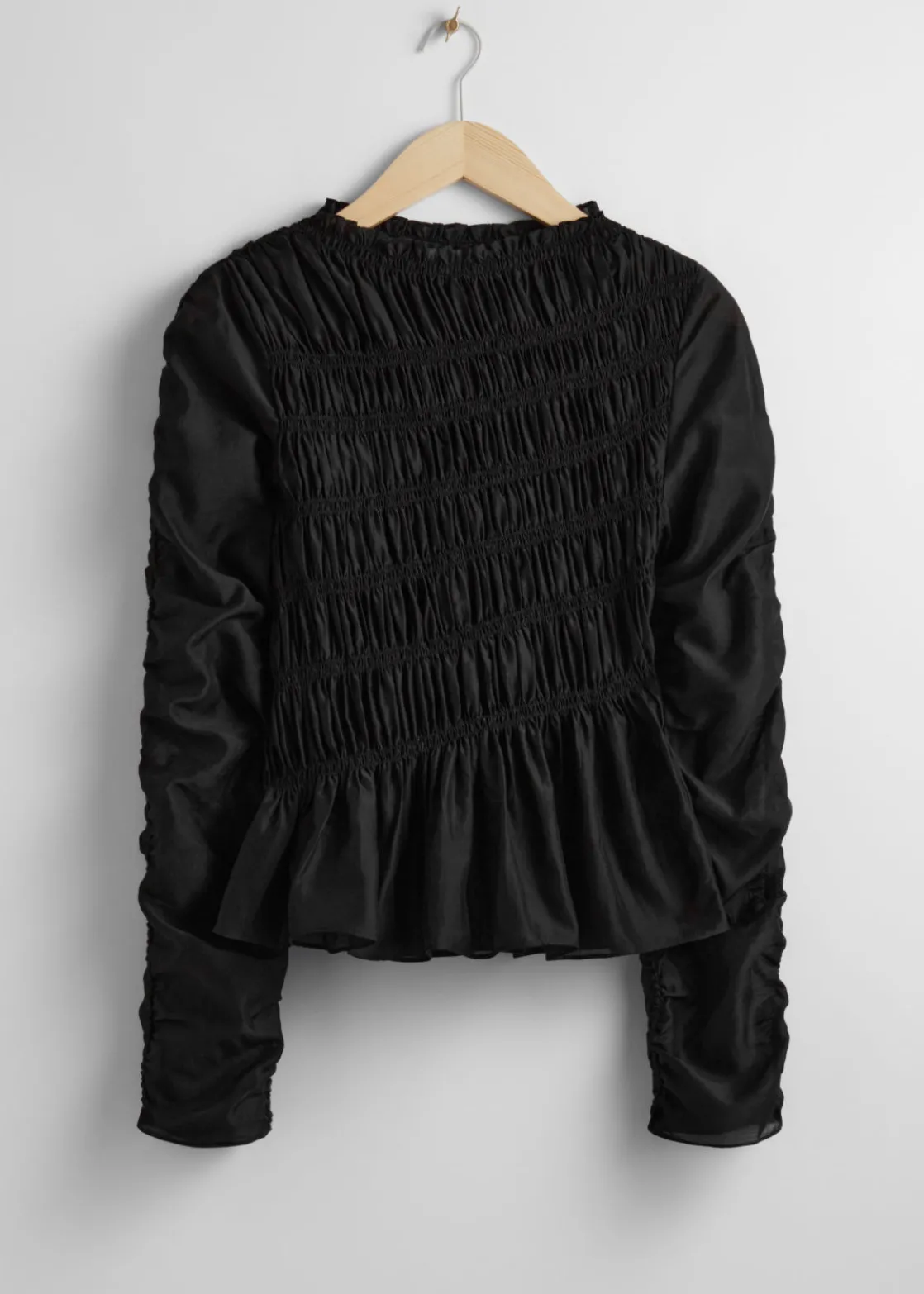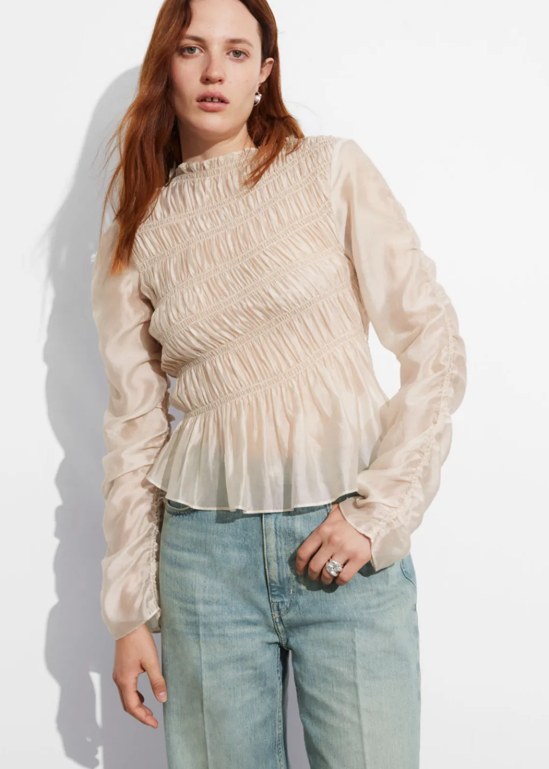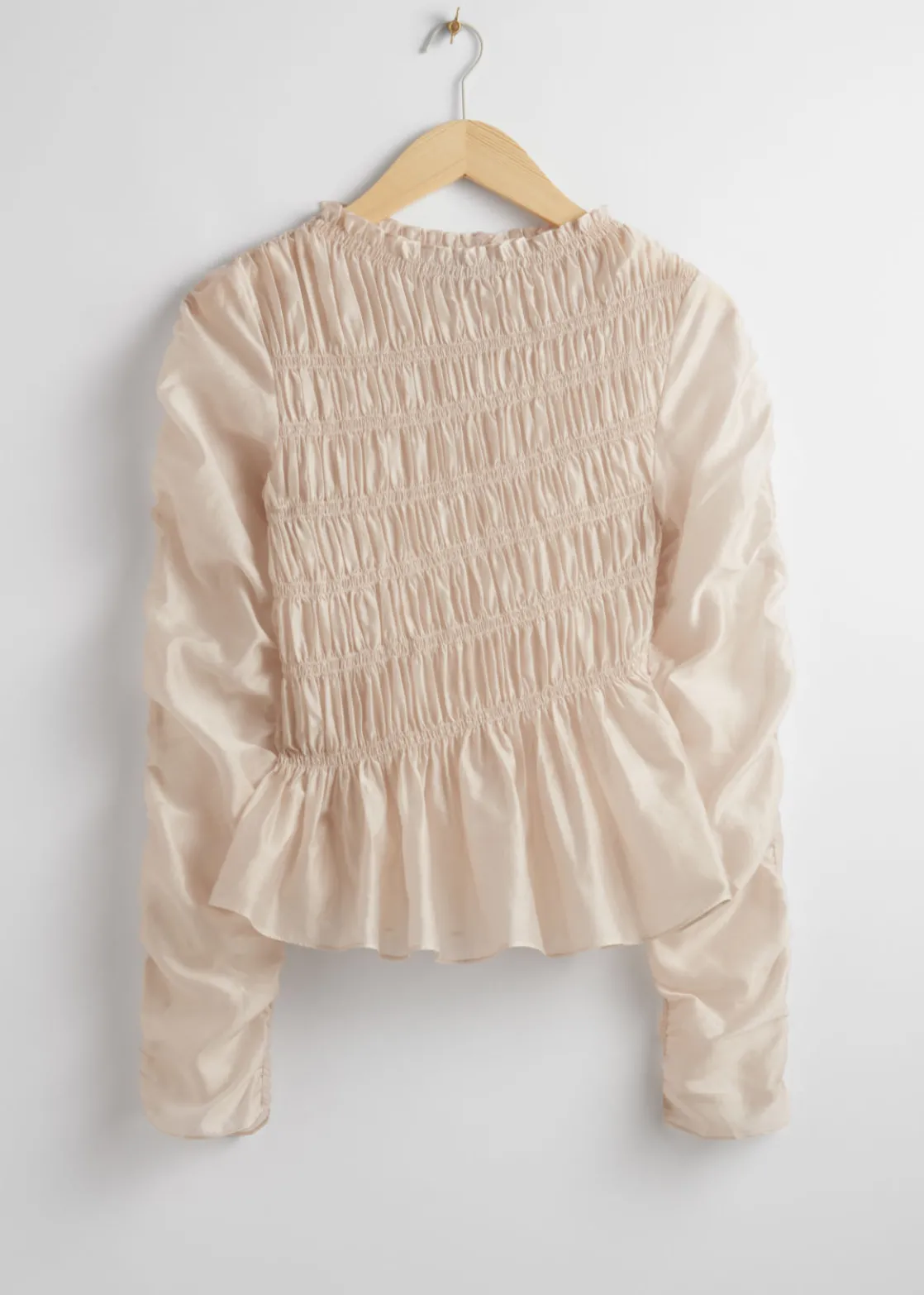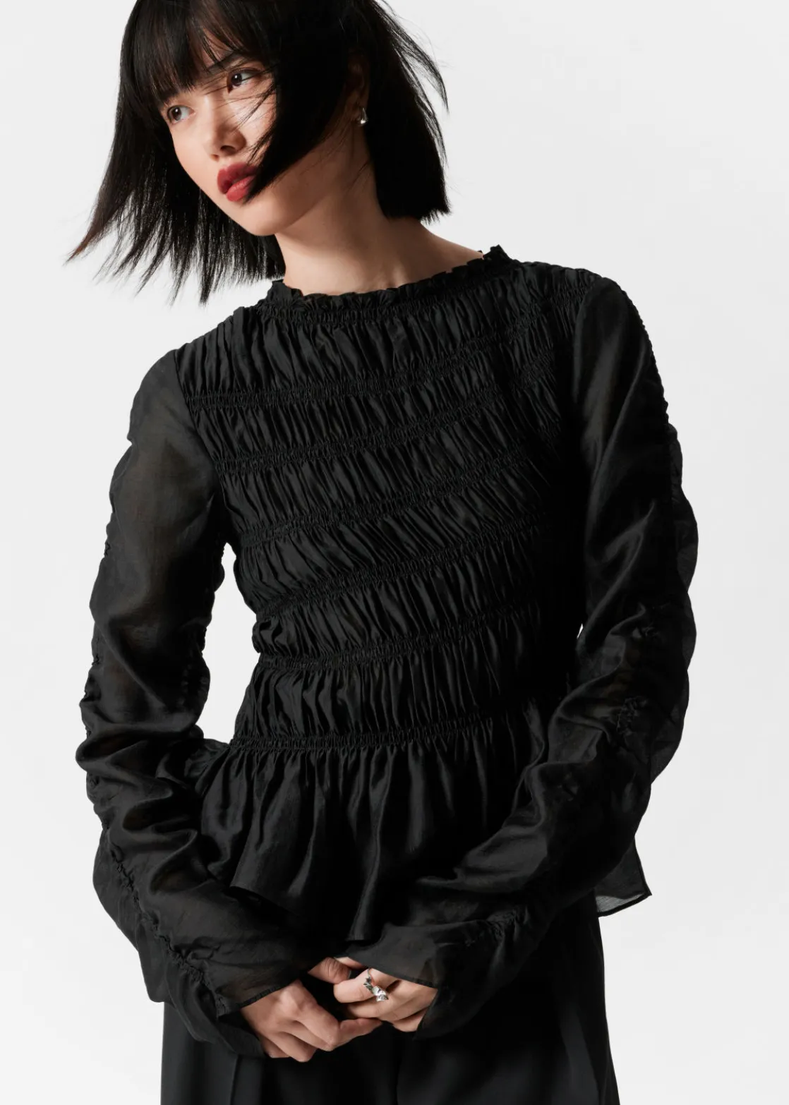 Long-sleeve top featuring diagonal, smocked detailing across the body and ruched sleeves.