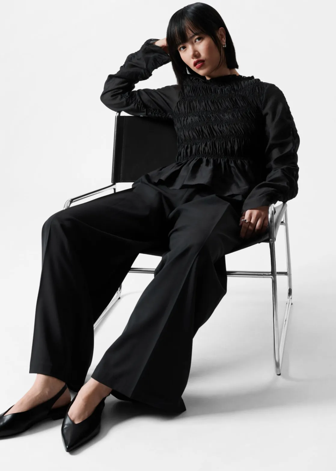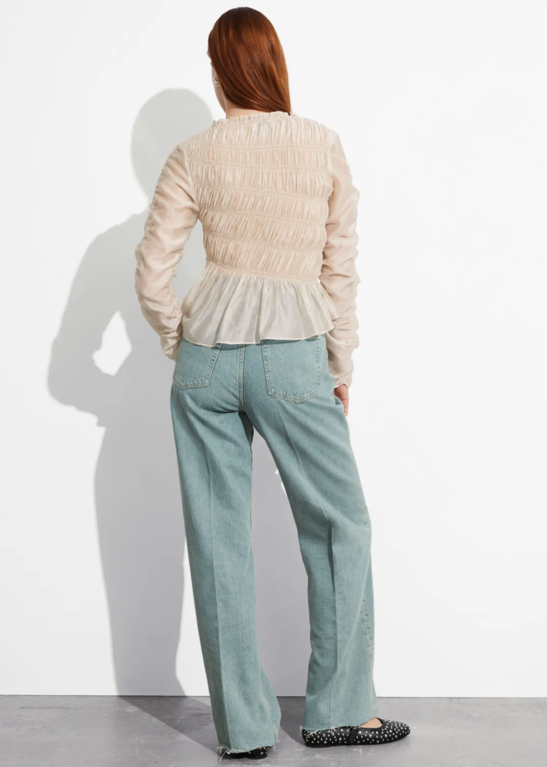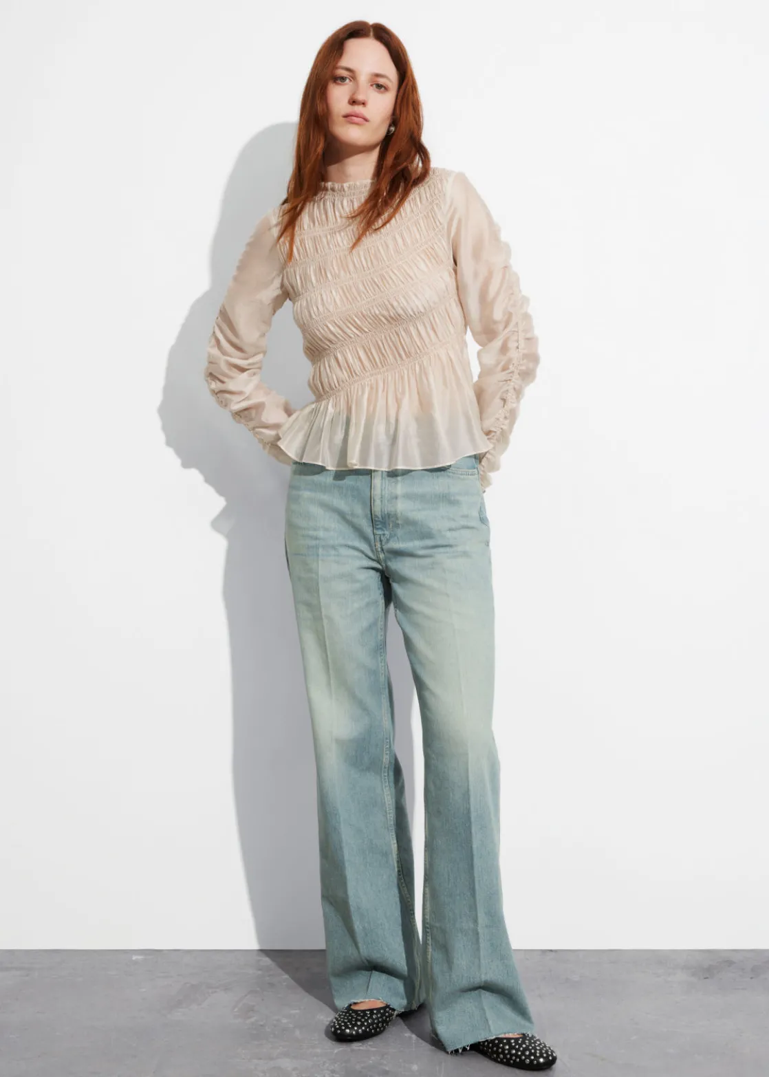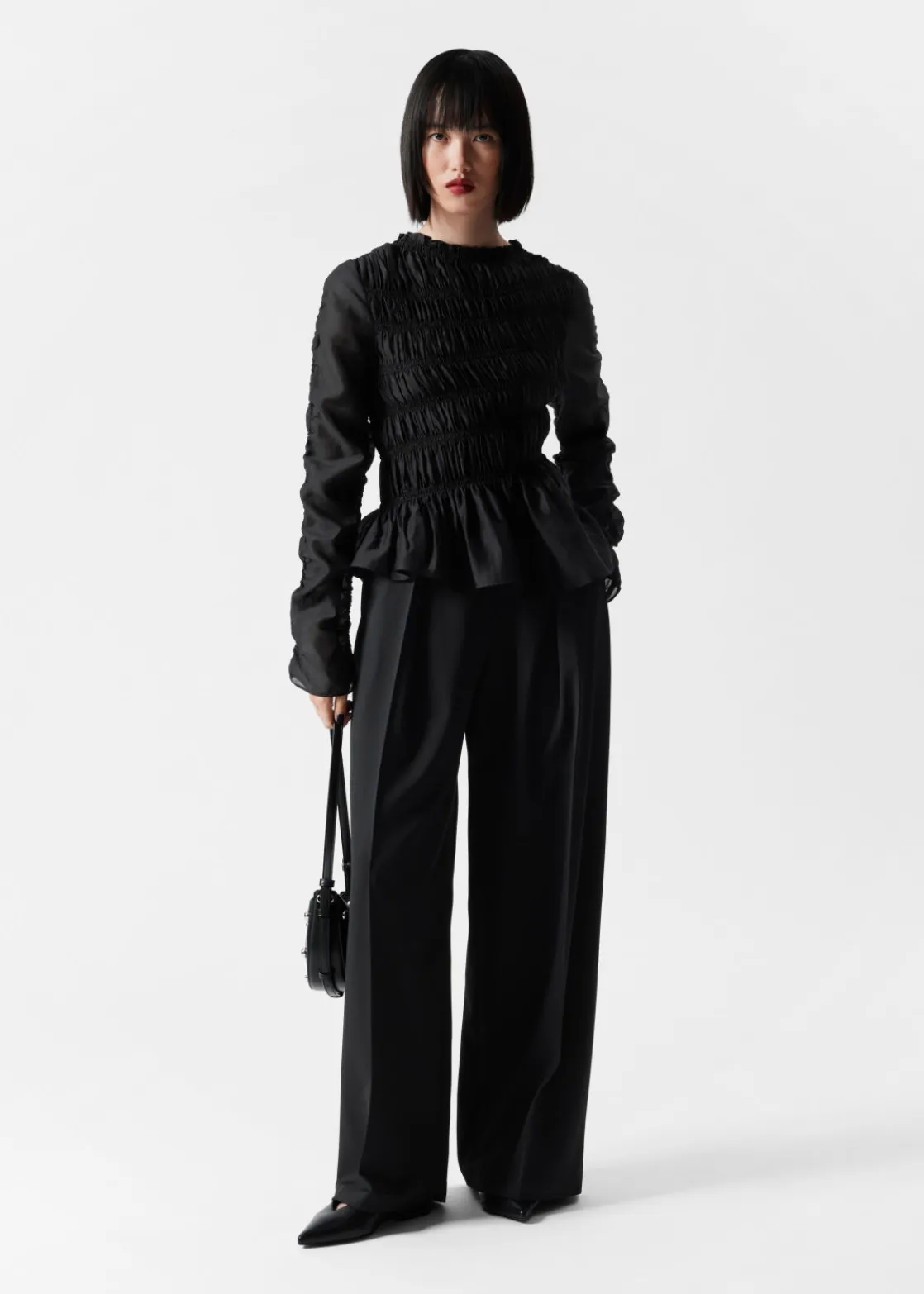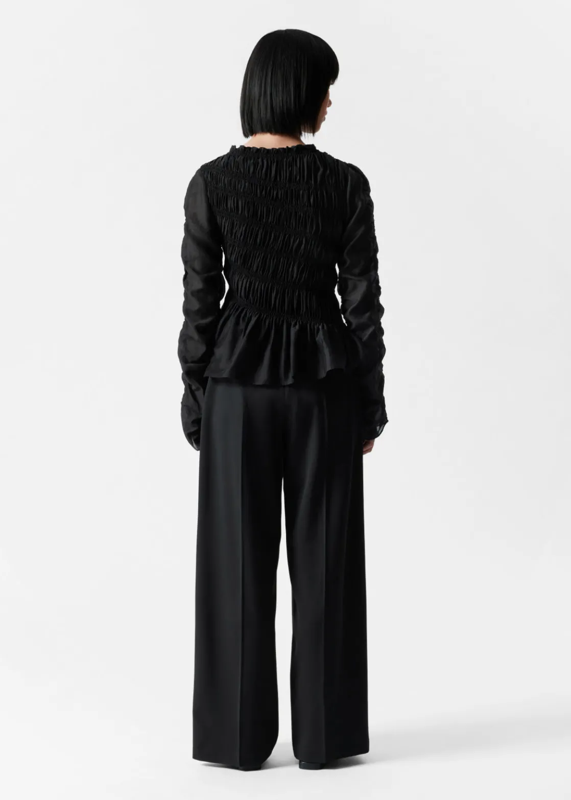 Long-sleeve top featuring diagonal, smocked detailing across the body and ruched sleeves.