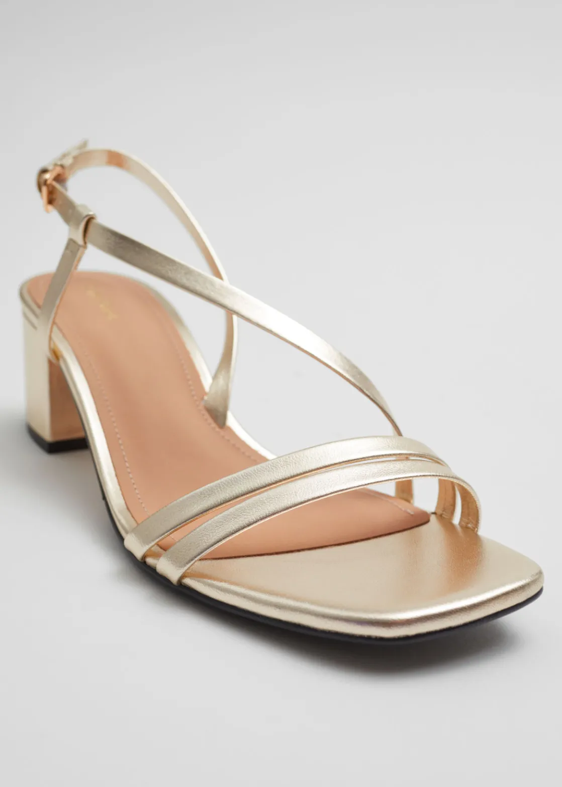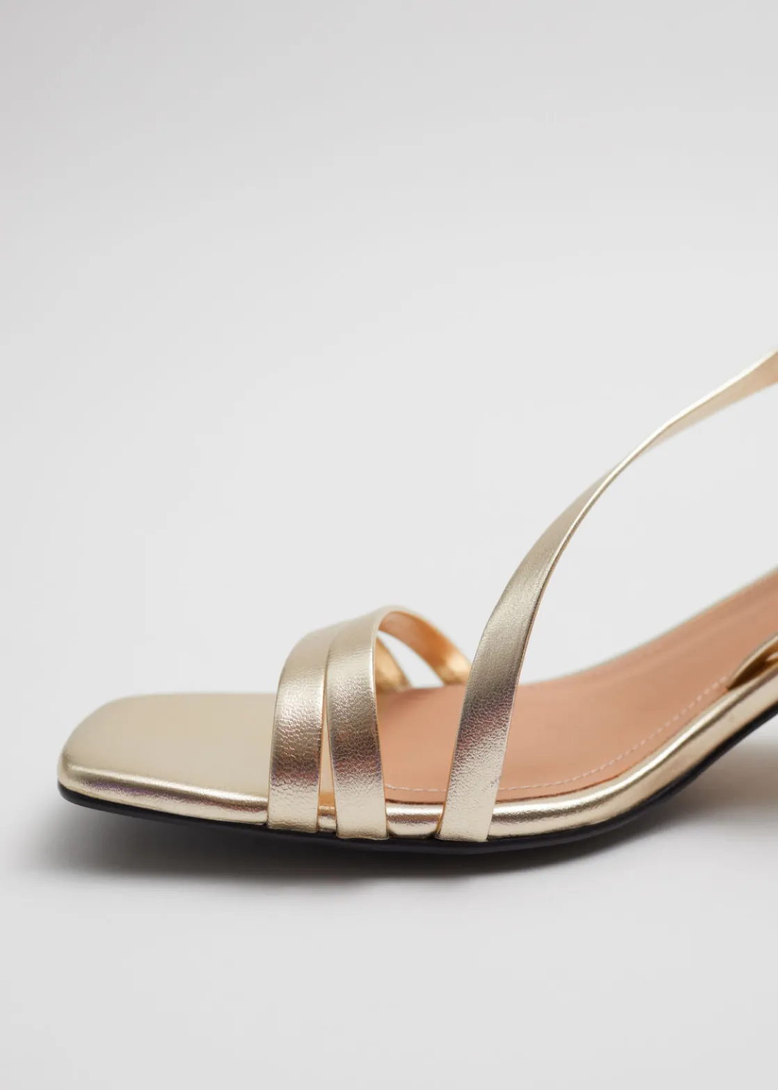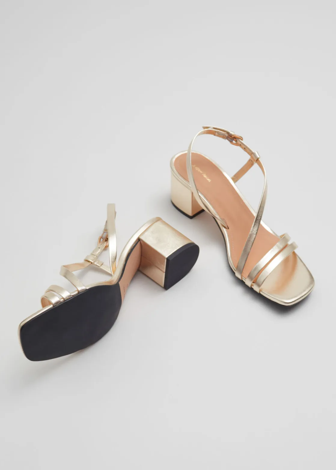 Strappy square-toe sandals with stacked block heels. Crafted from leather and finished with adjustable back straps featuring delicate gold-toned buckle closures.