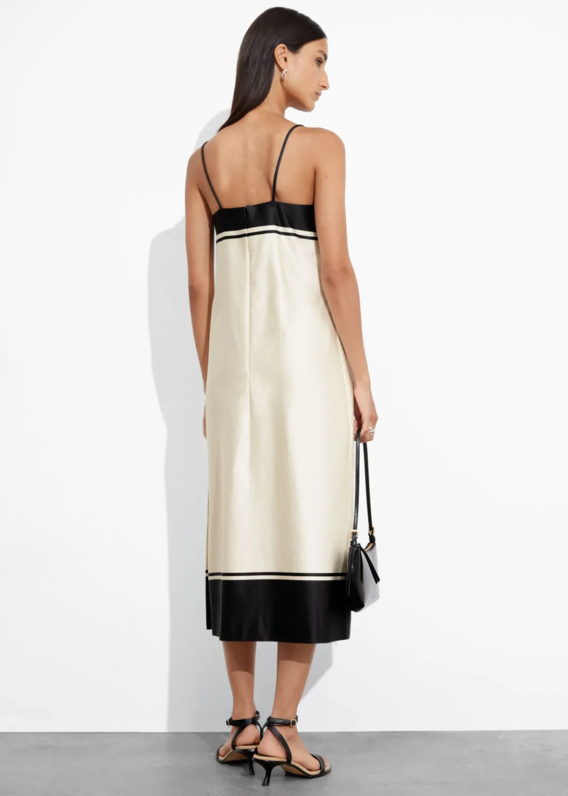 Satin midi dress featuring thin shoulder straps and a square neckline. Fastened with a zipper at the back.
