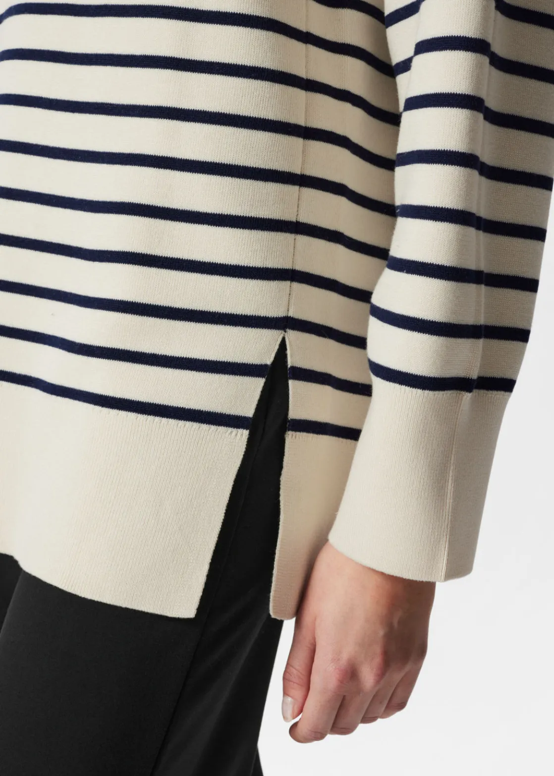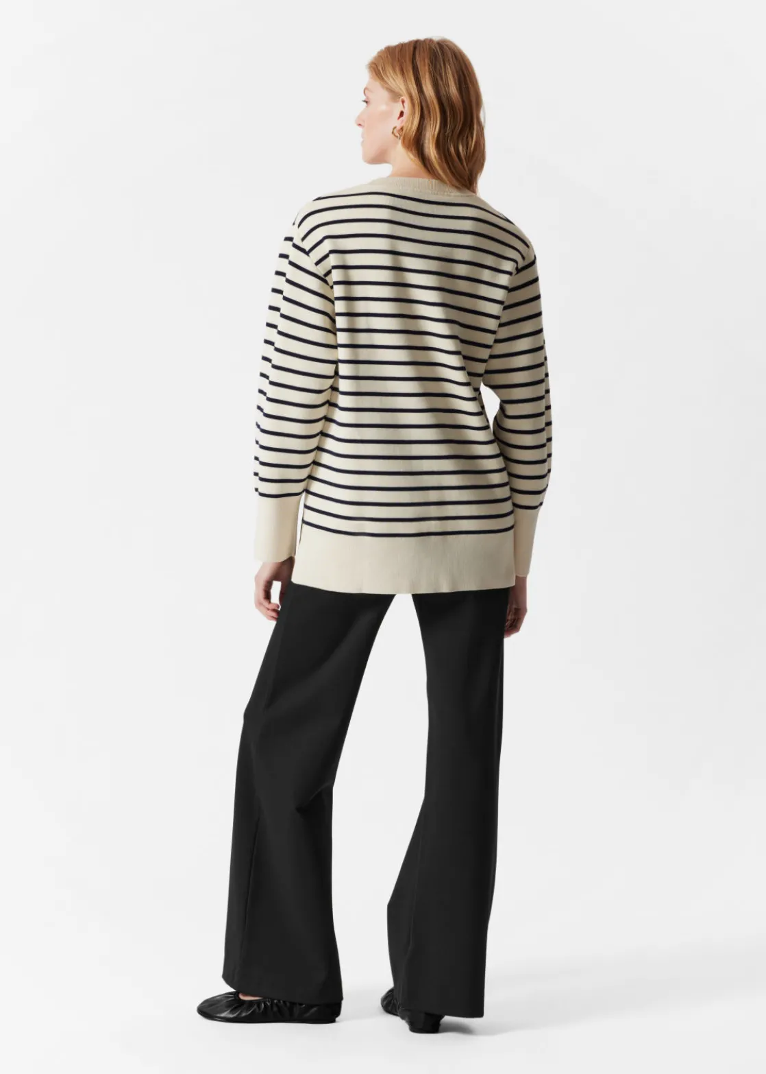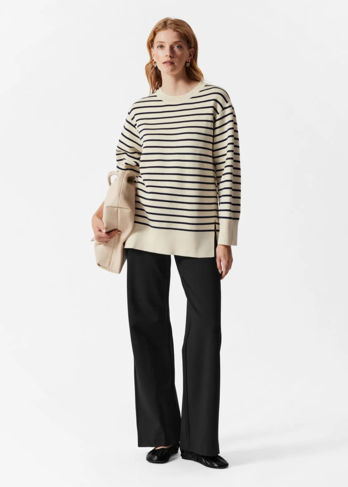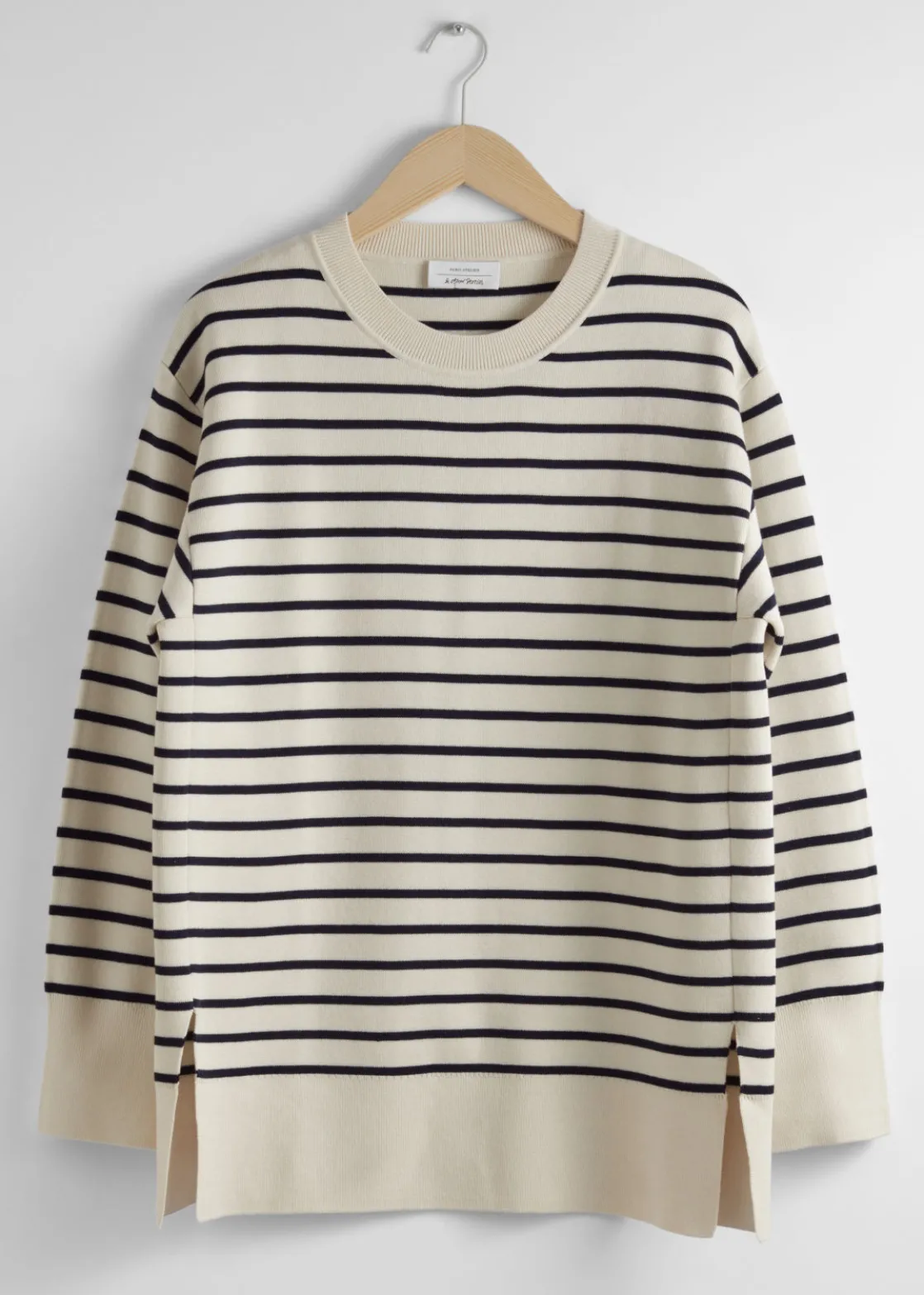 Long-sleeve knit sweater with a striped finish and slits at the sides.