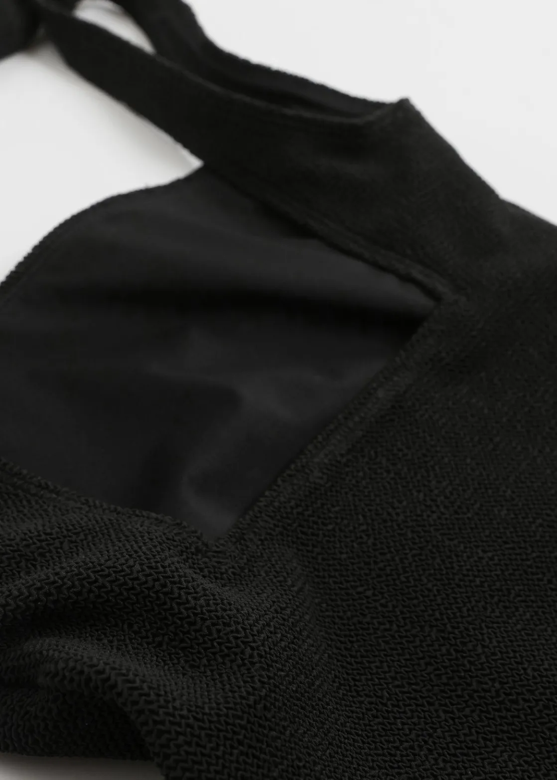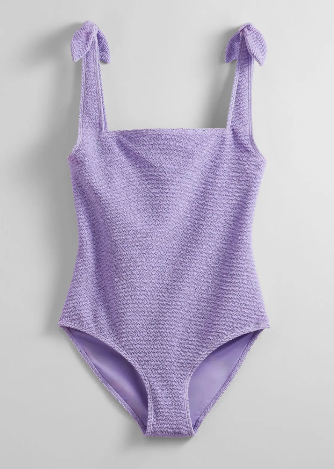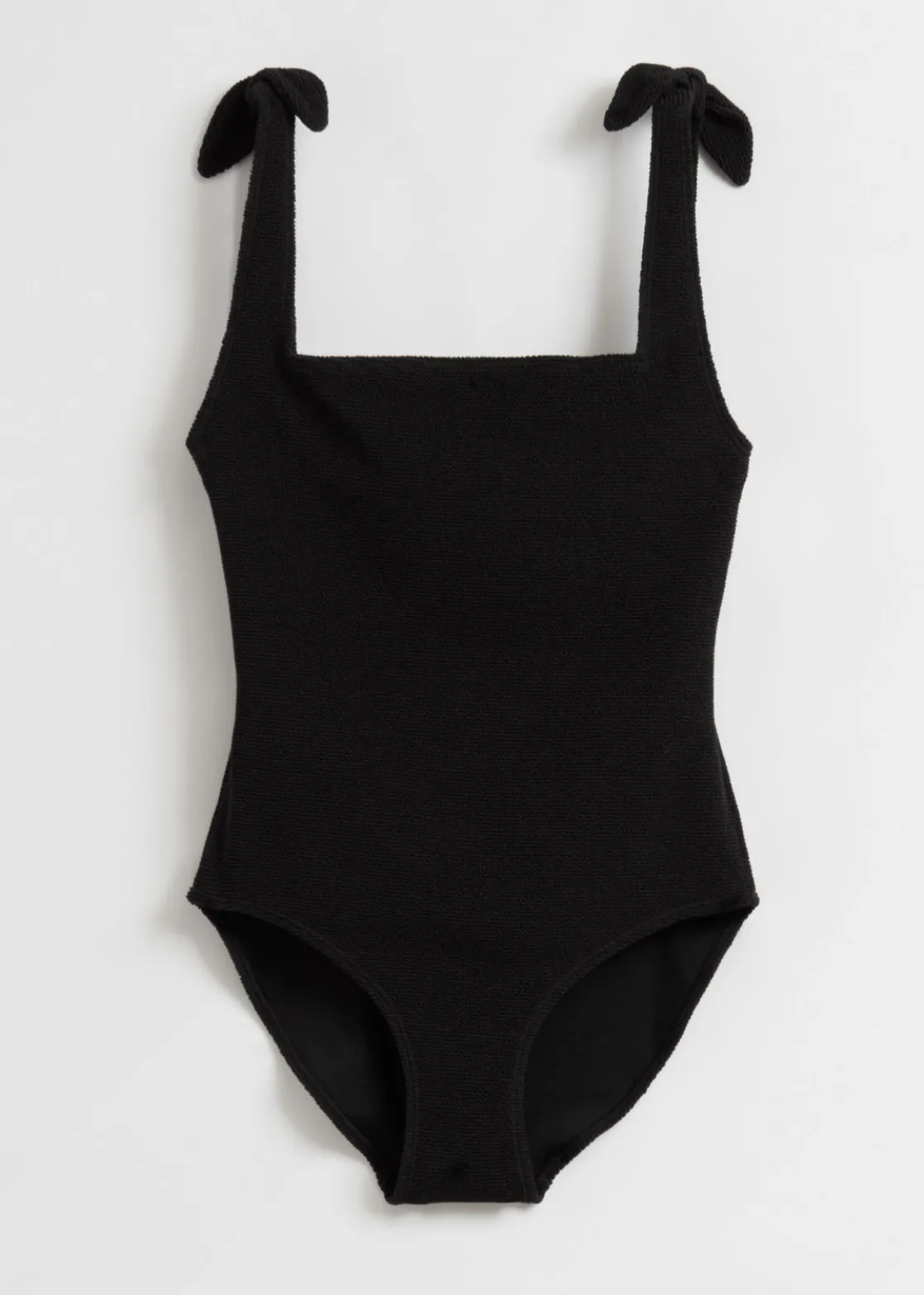 Textured one-piece swimsuit featuring decorative bow ties at the shoulders and a squared neckline.
