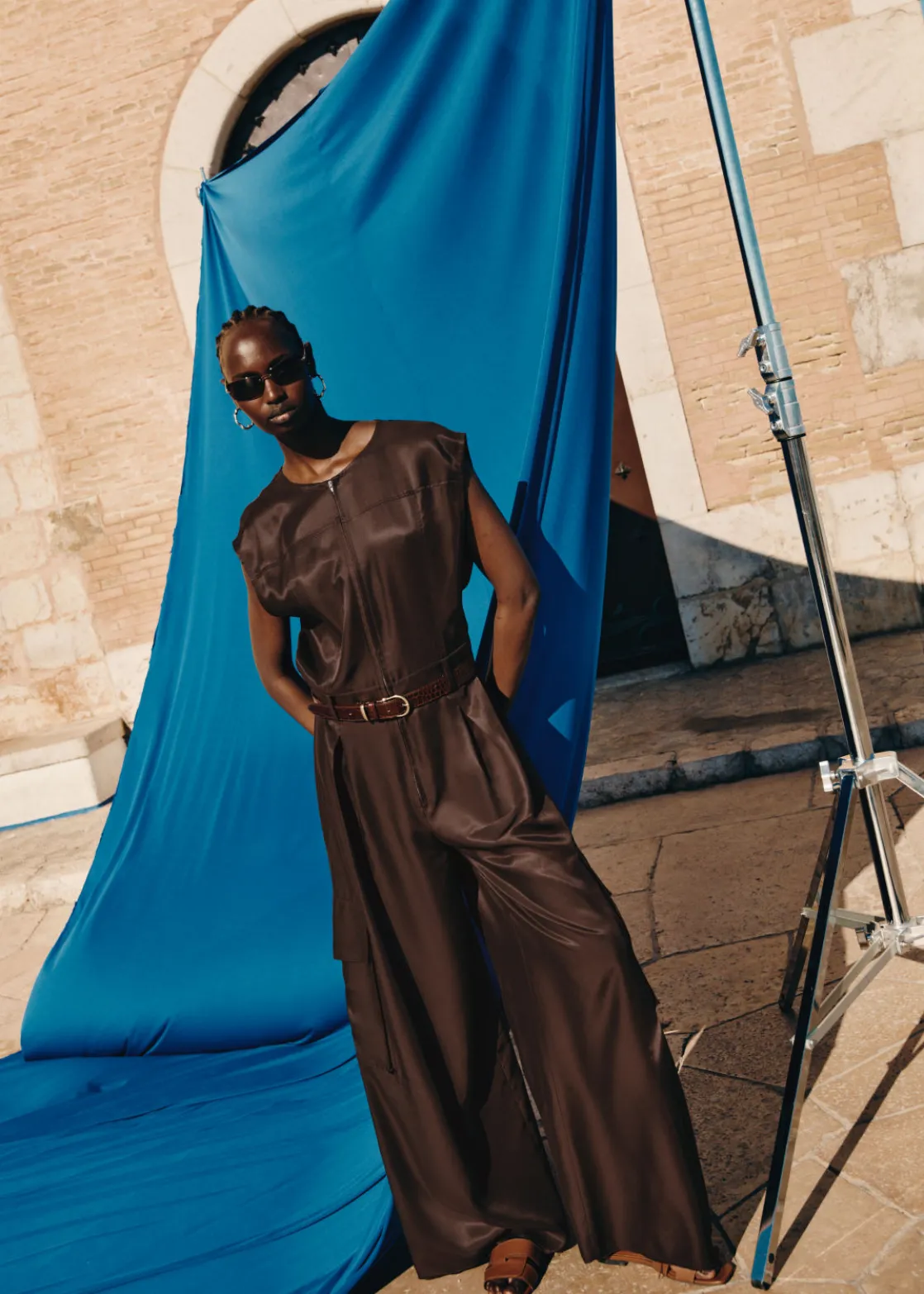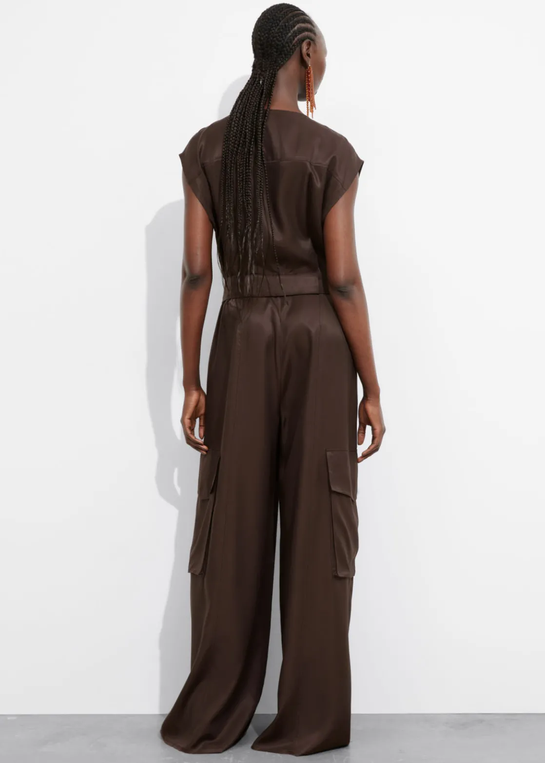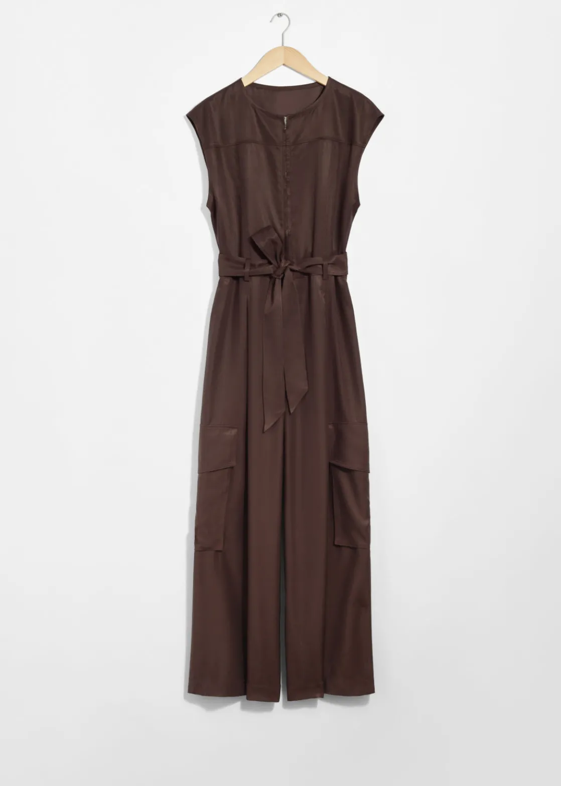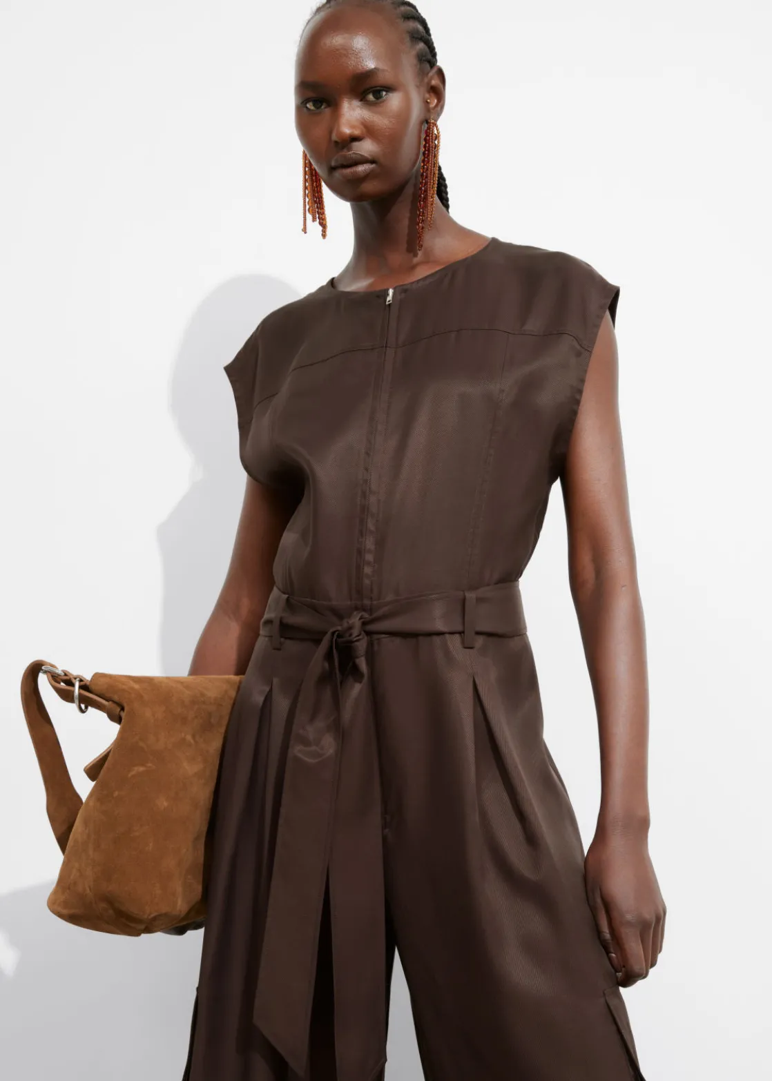 Belted zip-up jumpsuit featuring workwear-inspired detailing. Finished with large patch pockets at the legs.