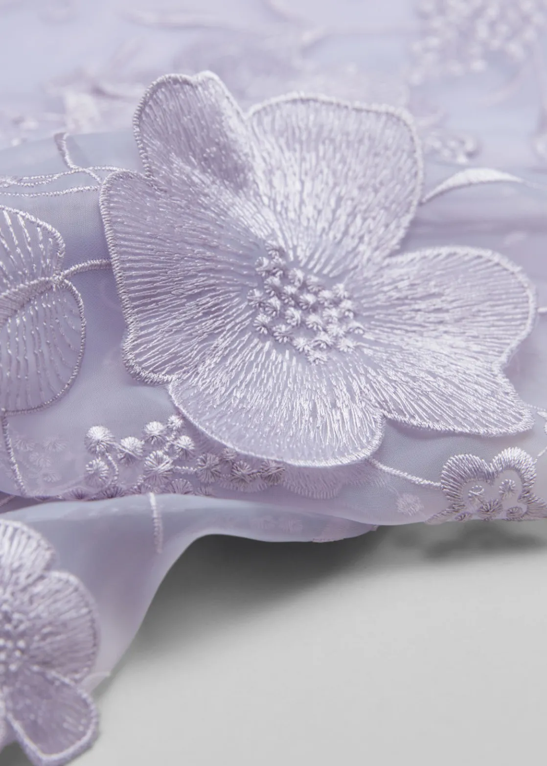 Voluminous A-line midi skirt featuring an organza finish with floral appliqués and embroidery.