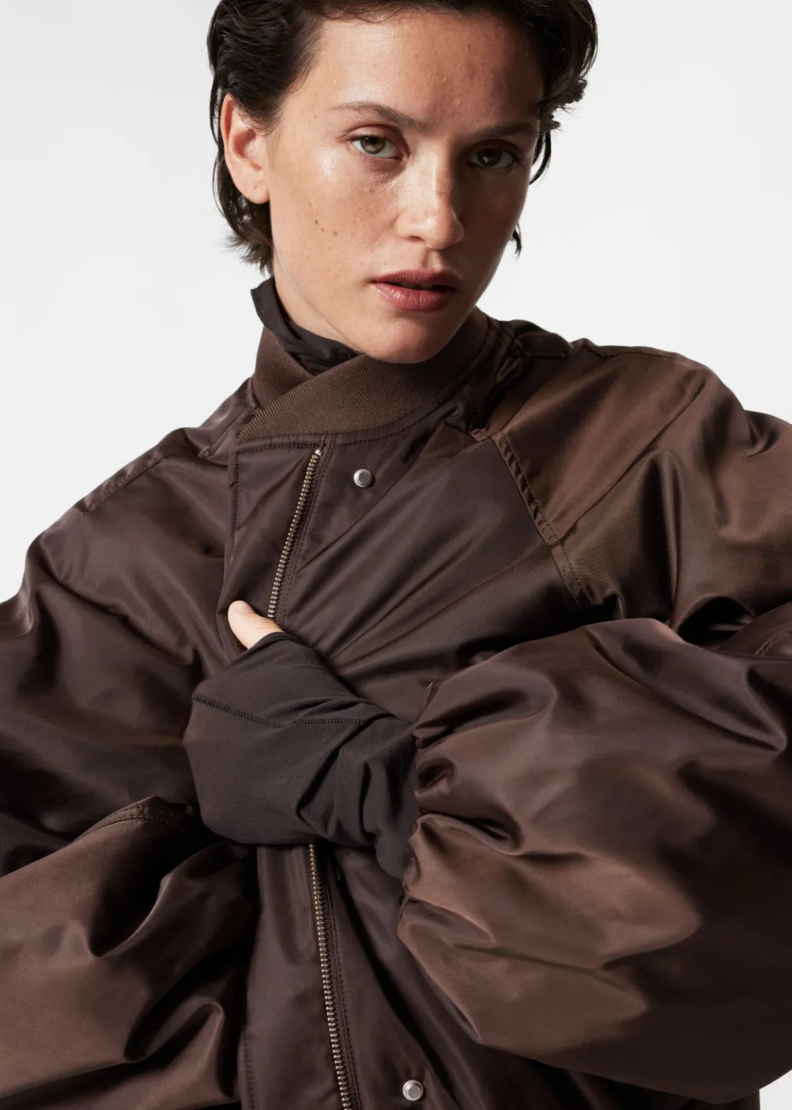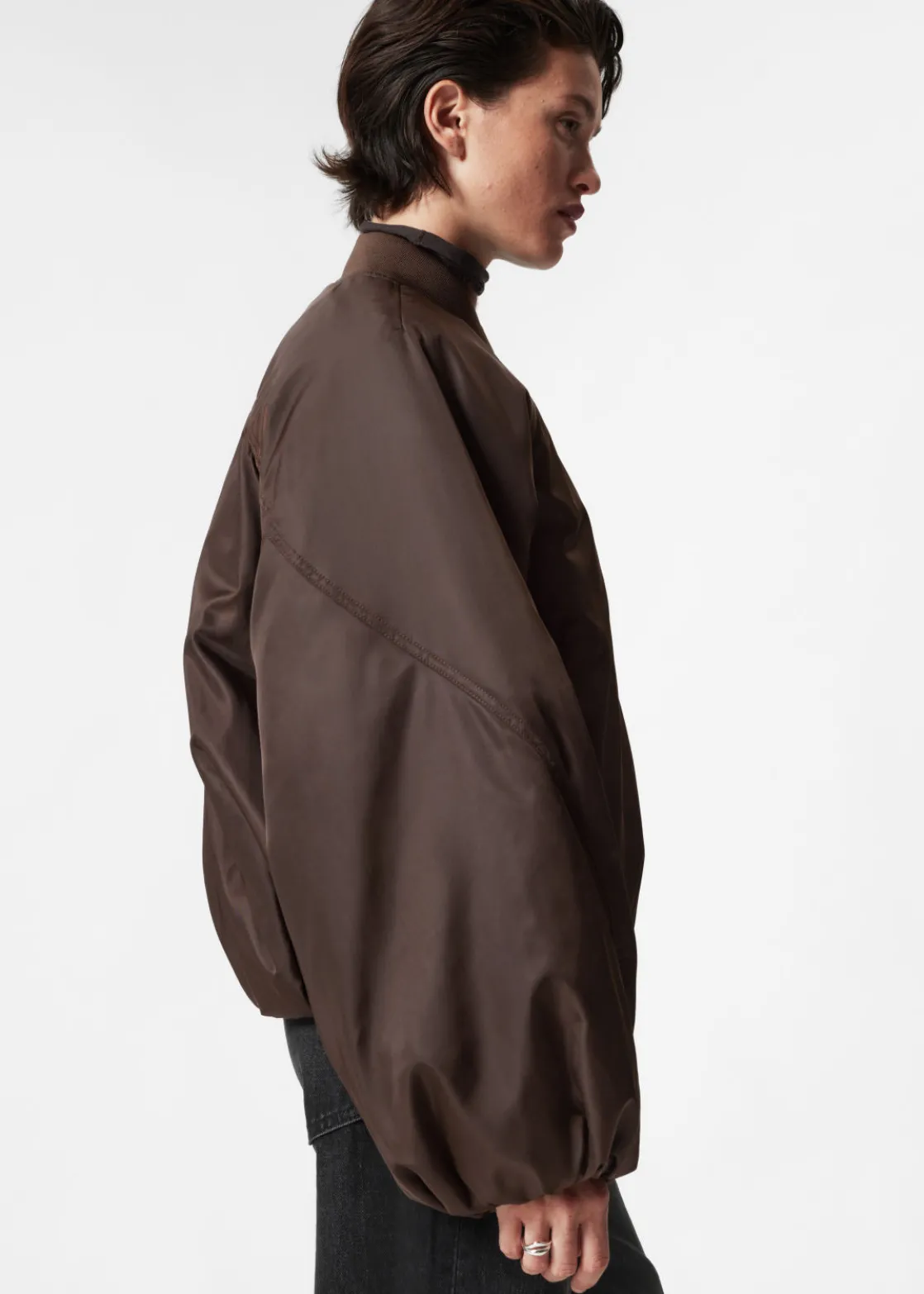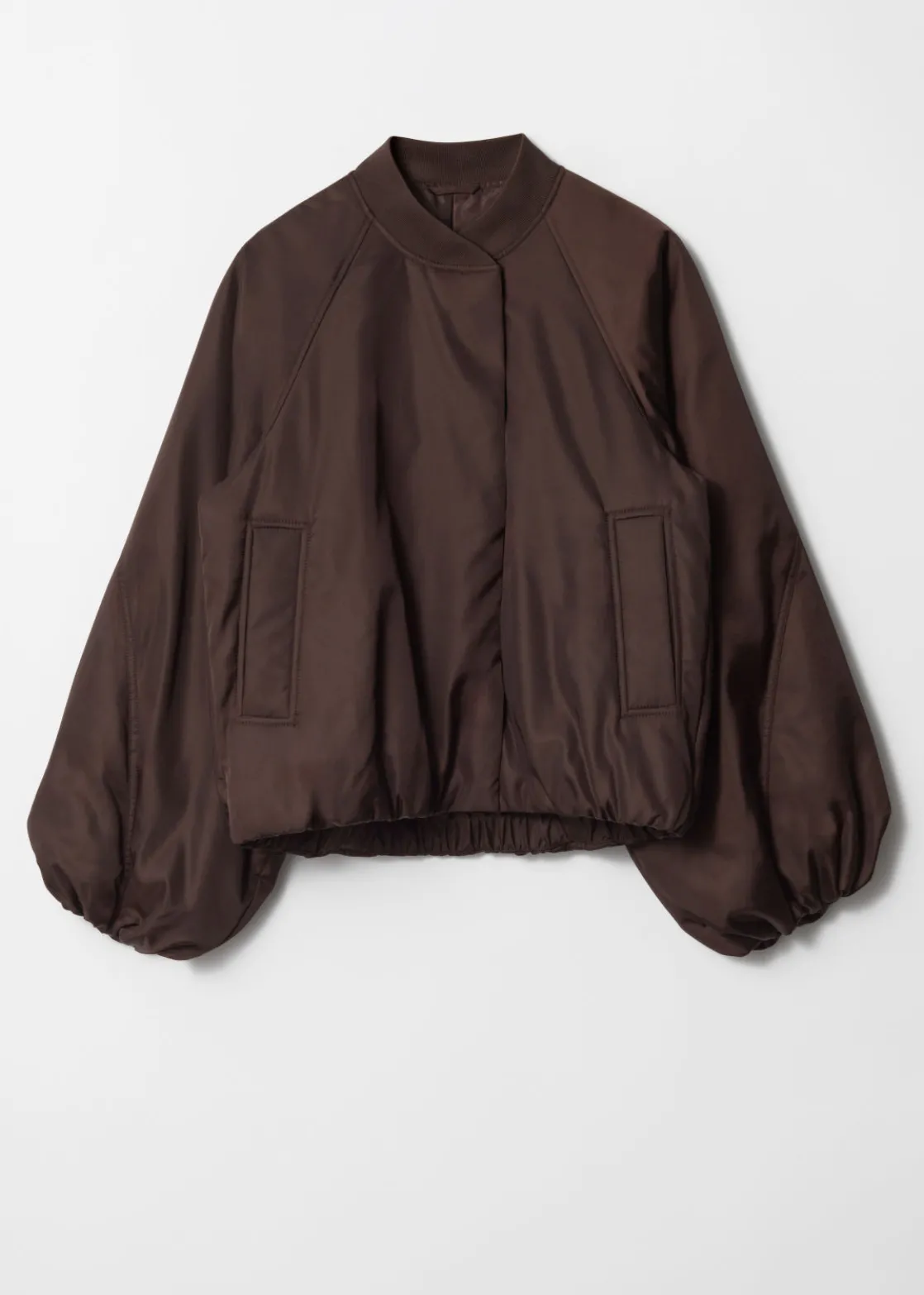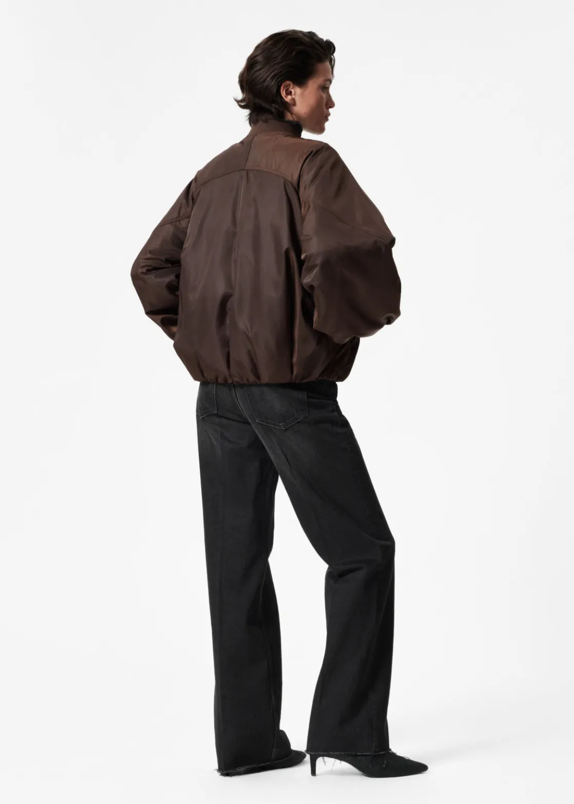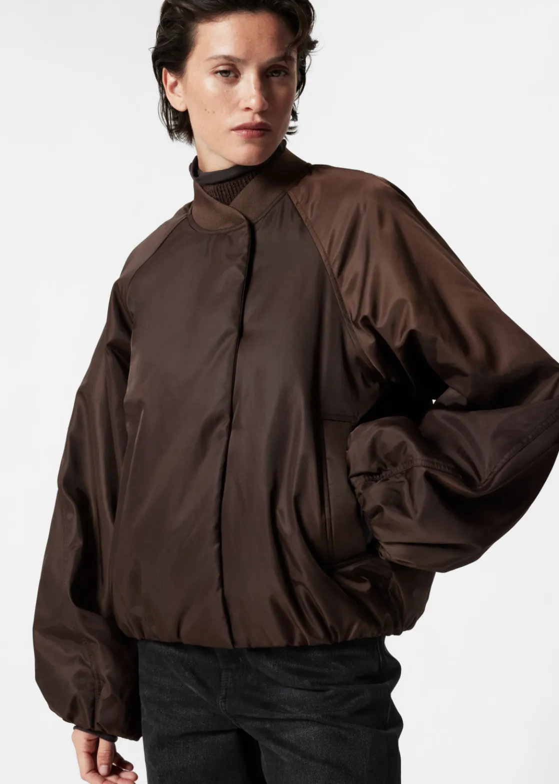 Padded bomber jacket with a technical finish. Designed with billowy sleeves and duo welt pockets.