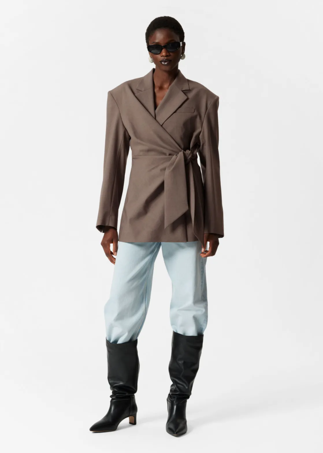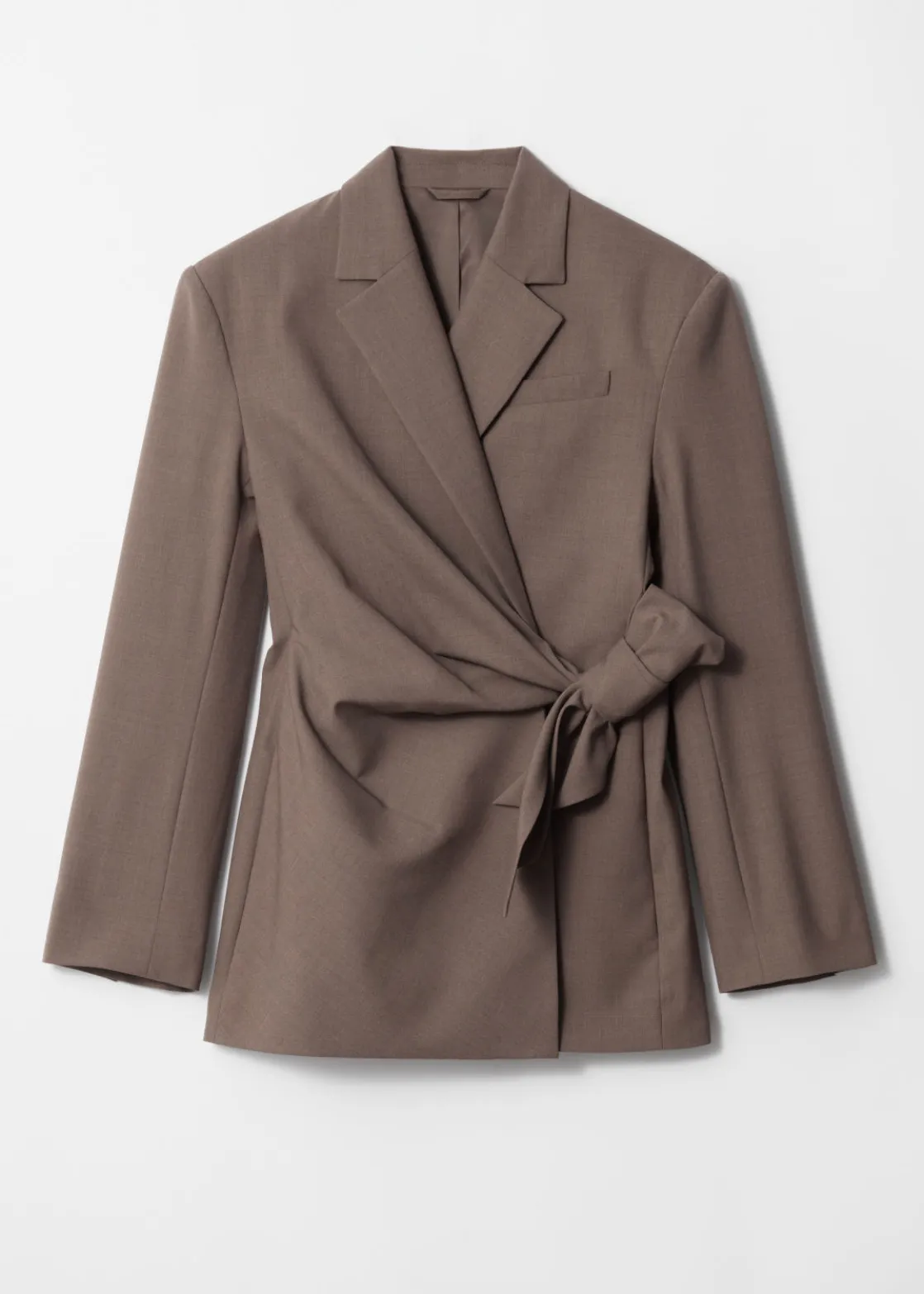 Wool-blend blazer featuring a gently draped wrap lapel secured with a tie at the side.